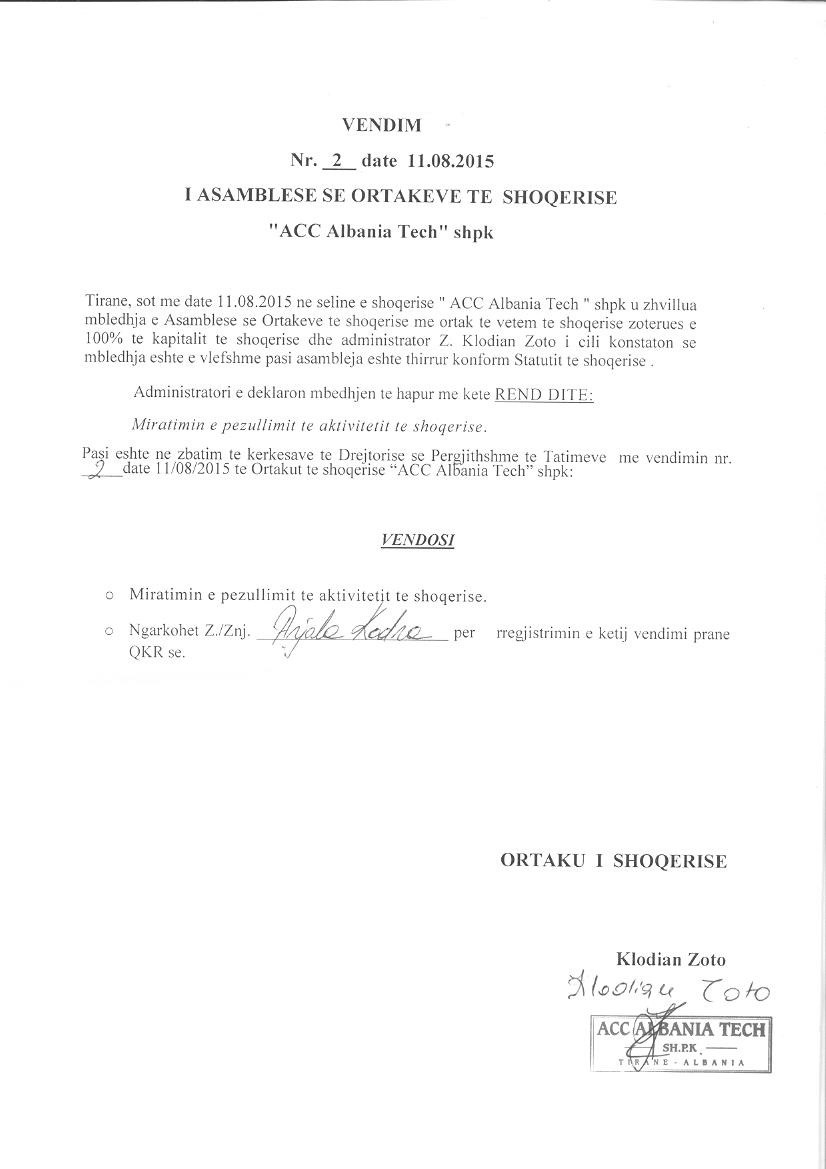 → Ekstrakt historik i regjistrit tregtar date 16.02.2022 → Statuti i shoqerise → Vendimi i asamblese se ortakeve per pezullimin e aktivitetit date 11.08.2015 → Ekstrakt Historik i Regjistrit Tregtar date 14.07.2023 |