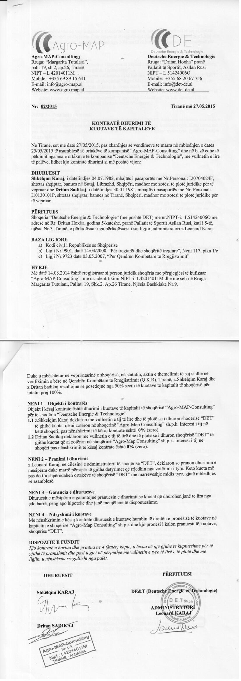 | Shoqëri Mëmë / Zotërues për këtë Subjekt: | “Deutsche Energie & Technologie”, shoqëri me përgjegjësi të kufizuar, e themeluar më datë 11/02/2015, sipas ligjeve të Republikës së Shqipërisë, me numër identifikimi në regjistrin tregtar NIPT L51424006O, me adresë aktuale në Elbasan Prrenjas Prapa ish Bitumit dhe Ish Fushes se Druve me Nr Pasurie 860/1, Volumi 7, Faqe 78, Zona Kadastrale 3203, dhe me administrator dhe ortak të vetëm Shkëlqim Karaj. (Sipas të dhënave të QKB deri më datë 16.04.2024) Sipas Ekstraktit Historik te Regjistrit te Pronarit Perfitues, depozituar në QKB date 12.03.2021, terhequr date 16.04.2024, Pronaret perfitues te subjektit “Agro-MAP-Consulting”, zoterues te 25% te kapitalit e me teper, eshte: Shkëlqim Karaj, shtetas shqiptar, i datelindjes 1982, pronar perfitues per 50% te kapitalit, pasi zotëron 50% të kapitalit të “Deutsche Energie & Technologie” – shoqëri mëmë për 100% të kapitali të “Agro-MAP-Consulting”. Data e percaktimit si pronar perfitues eshte 29.12.2020. Matthias Buscher, shtetas gjerman, i datelindjes 1983, pronar perfitues per 50% te kapitalit, pasi zotëron 50% të kapitalit të “Deutsche Energie & Technologie” – shoqëri mëmë për 100% të kapitali të “Agro-MAP-Consulting”. Data e percaktimit si pronar perfitues eshte 29.12.2020. -------------------------------------- Ekstrakti Historik i Regjistrit të Pronarit Përfitues të Shoqërisë “Agro-MAP-Consulting” është i papërditësuar. Referuar Ligjit Nr.112 datë 28.07.2020, “Për Regjistrin e Pronarëve Përfitues”, i ndryshuar , në nenin 5, pika ç, parashikohet se “në rastin e regjistrimit të ndryshimeve të të dhënave të pronarëve përfitues të subjekteve raportuese, regjistrimi bëhet brenda 90 (nëntëdhjetë) ditëve kalendarike nga data e ndodhjes së ndryshimit faktik.” Në bazë të dispozitës ligjore të sipërcituar, subjekti në fjalë është në shkelje në lidhje me kryerjen e ndryshimeve të nevojshme në Regjistrin e Pronarëve Përfitues. Pronar përfitues për “Agro-MAP-Consulting”, sipas të dhënave të QKB, rezulton Shkëlqim Karaj, shtetas shqiptar, i datelindjes 1982, pronar perfitues per 100% te kapitalit, pasi zotëron 100% të kapitalit të “Deutsche Energie & Technologie” – shoqëri mëmë për 100% të kapitali të “Agro-MAP-Consulting”. |