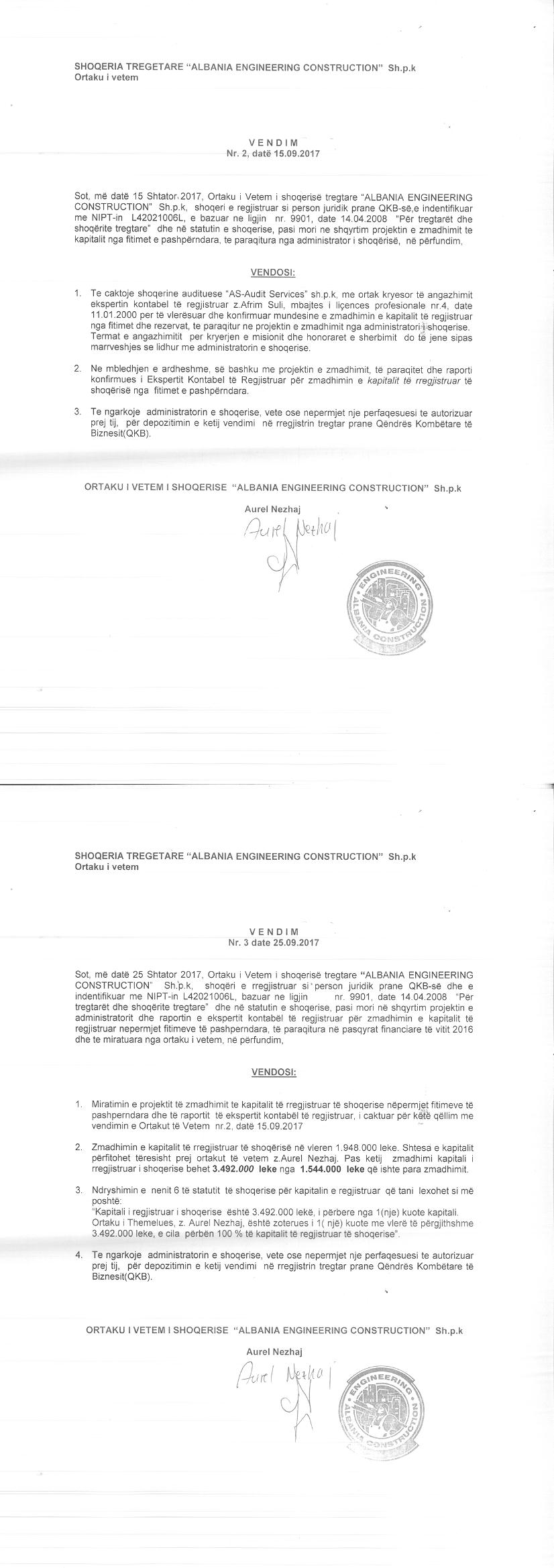 → Ekstrakt Historik i Regjistrit Tregtar date 27.03.2024 → Akt themelimi i Shoqerise → Vendim i Ortakut të Vetëm, Zmadhim Kapitali datë 10.01.2016 → Vendim i Ortakut të Vetëm, Zmadhim Kapitali datë 25.09.2017 → Vendim i Ortakut të Vetëm, Zmadhim Kapitali datë 03.08.2019 → Vendimet e Asamblesë së Ortakut të Vetëm të Shoqërive "Albania Engineering Construction" shpk dhe "A2 Engineering" shpk për Bashkimini nëpërmjet Përthithjes datë 16.09.2022 → Projekt Marrëveshje e Bashkimit nëpërmjet Përthithjes të Shoqërive "Albania Engineering Construction" shpk dhe "A2 Engineering" shpk datë 16.09.2022 → Raport Bashkimi me Përthithje i Shoqërive "Albania Engineering Construction" shpk dhe "A2 Engineering" shpk datë 16.09.2022 → Kontratë Shitje Kuotash Kapitali datë 14.12.2022 |