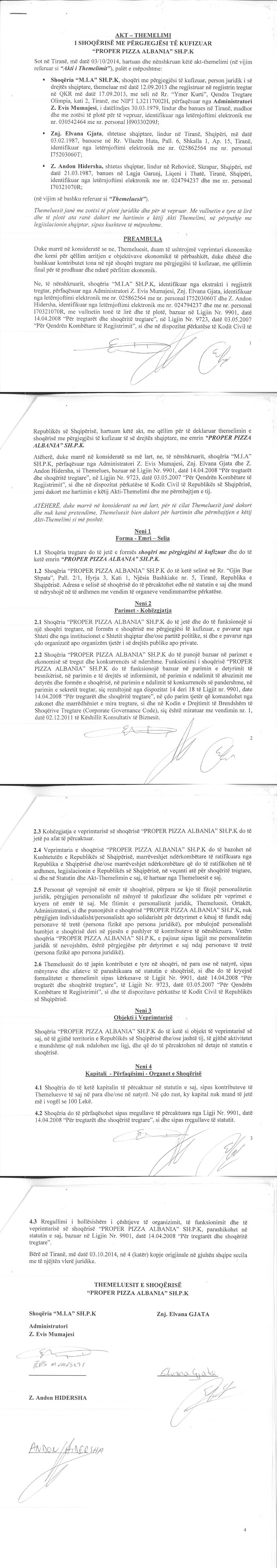 Objekti i Veprimtarisë: Veprimtari franchising te markes tregtare fast-food "Proper Pizza".Prodhimi dhe shitje produkte fast-food te markes tregtare "Proper Pizza", sherbim taksi dhe sherbim ne vend. Veprimtari bar-kafe dhe restorant. Import-eksport te pijeve alkolike dhe freskuese, produkteve fast-food, ambalazheve fast-food, si dhe veprimtari punishte per prodhimin dhe perpunimin e produkteve te ndryshme fast-food.Importeksport te mallrave industrial, ushqimore, bujqesore, fruta perime, tekstile. Shoqeria mund te kryeje çdo aktivitet qe lidhet direkt ose indirekt, rrjedh apo ka te beje me objektivat e renditura sa me lart.Shoqeria mund te ndermarre aktivitet tregtar, financiar, qe mund te konsiderohet i dobishem apo i nevojshem ne menyre qe te arrihet dhe permbushet objekti i Shoqerise. Shoqeria do te ndermarre cdo aktivitet te nevojshem per kontrollin dhe verifikimin e funksionimit sipas parimeve te rrjetit Franchising lidhur me standartin e cilesise dhe te sherbimit ne cdo shoqeri Franchismarrese dhe cdo shoqeri e cila ka te drejten e perdorimit te markes tregtare "PROPER PIZZA". Shoqeria mund te nderrmarre veprimtari mbeshtetese si shkembim eksperience, trajnime apo mbeshtetje ne menaxhimin e veprimtarise ne shoqerite te cilat perdorin marken tregtare "PROPER PIZZA" duke vendosur ne dispozicion specialist te trajnuar prej tij me qellim mos demtimin dhe promovimin e markes tregtare.