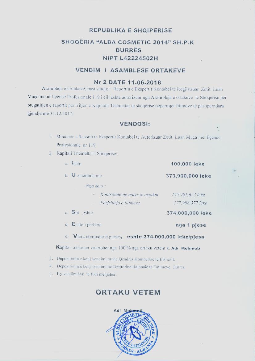 | Kapitali Themeltar(Lekë): | 374 000 000,00 |