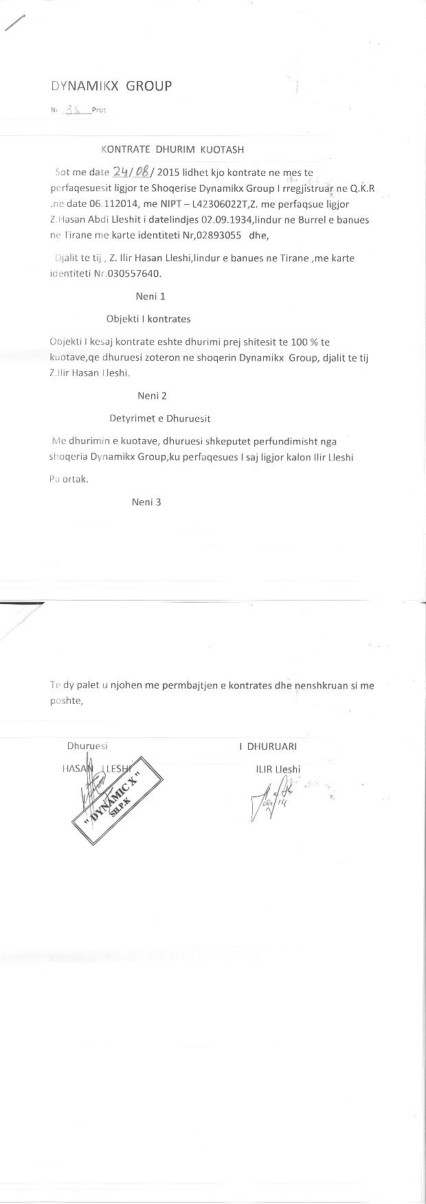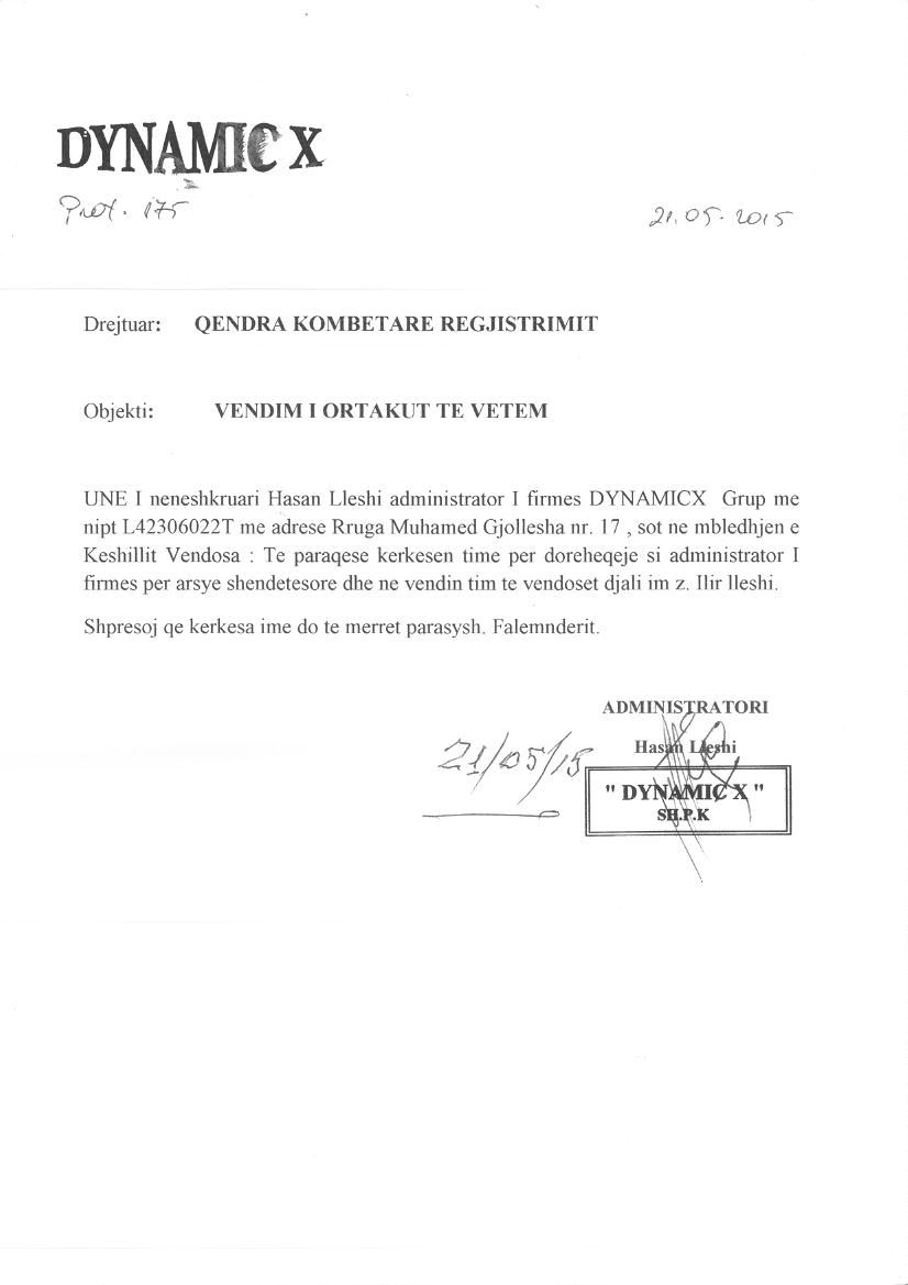 → Ekstrakt Historik i Regjistrit Tregtar, date 12.10.2021 → Statuti i shoqerise, date 3.11.2014 → Vendimi i asamblese se ortakut, date 21.05.2015 → Marrveshja e dhurimit te kuotave, date 24.08.2015 |
