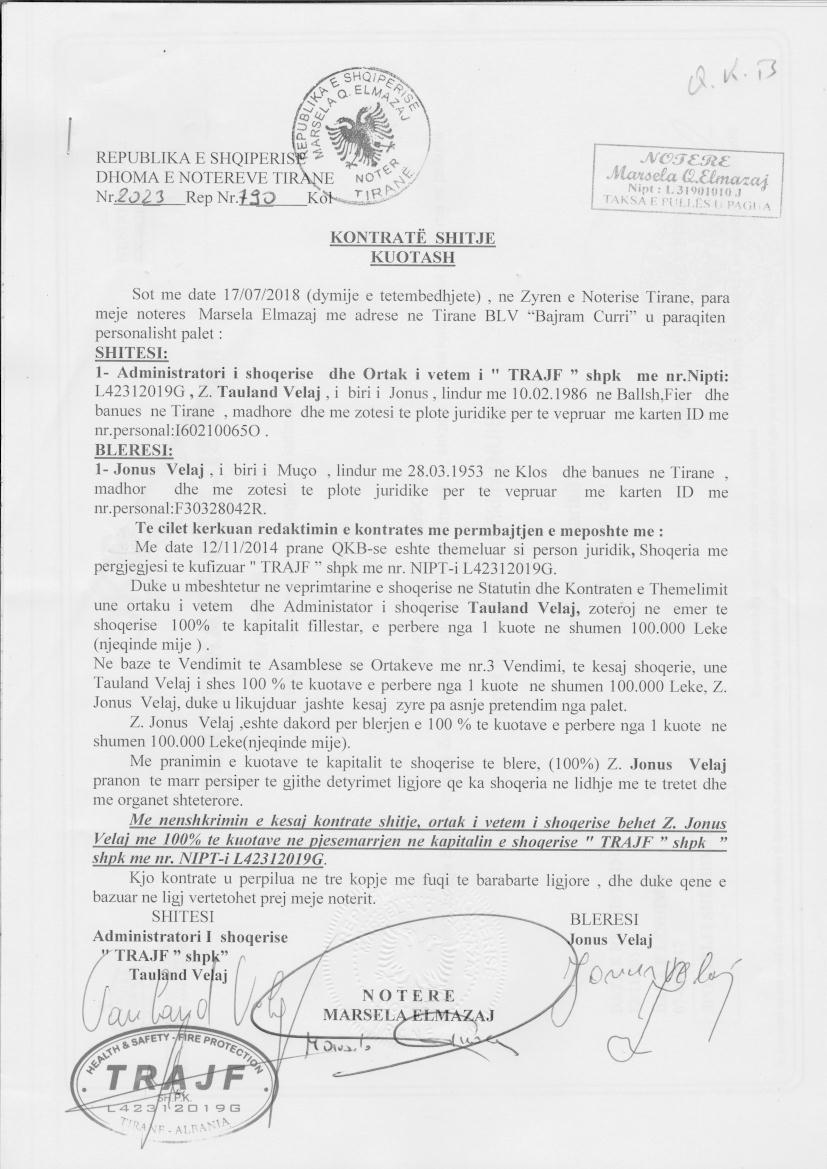 → Ekstrakti Historik i Regjistrit Tregtar date 07.01.2022 → Statuti i Shoqerise → Kontrate e shitjes se Kuotave date 05.12.2016 → Kontrate e shitjes se Kuotave date 17.01.2017 → Kontrate e shitjes se Kuotave date 10.07.2017 → Kontrate e Shitjes se Kuotave date 17.07.2018 → Kontrate e Shitjes se Kuotave date 21.01.2019 → Kontrate e Dhurimit te Kuotave date 26.04.2019 → Kontrate e Dhurimit te Kuotave date 07.01.2021 |