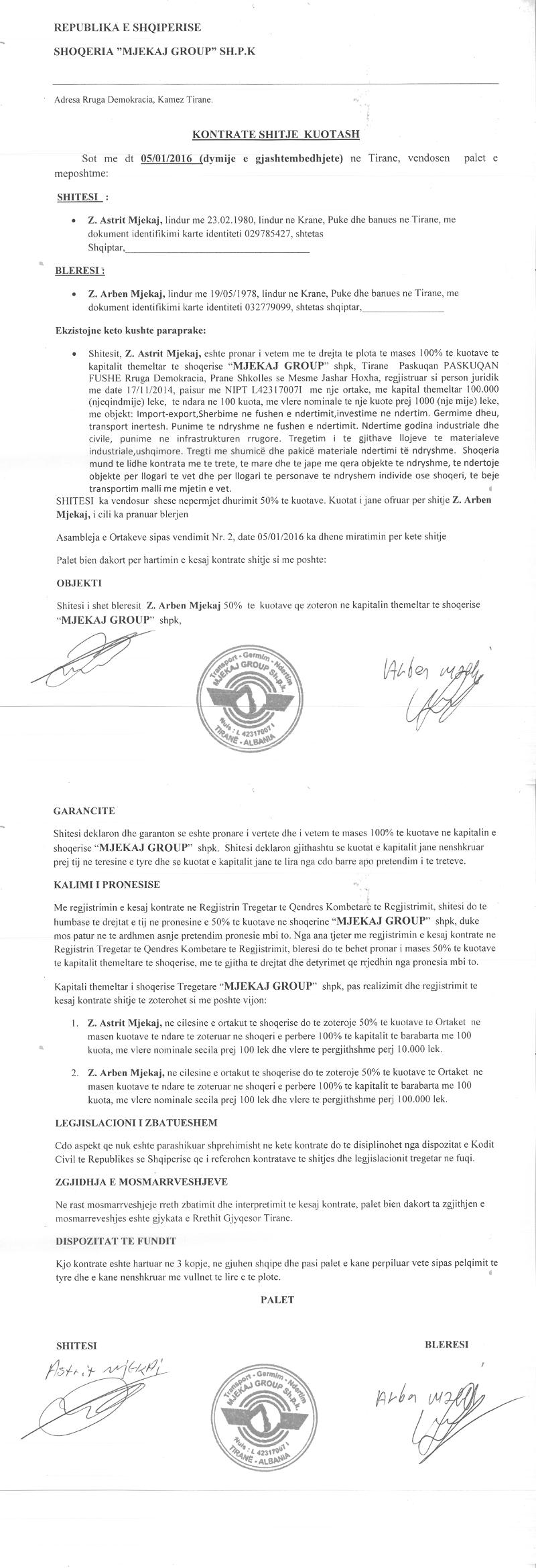 → Ekstrakti Historik i Regjistrit Tregtar date 22.08.2024 → Statuti i Shoqerise → Kontrate e shitjes se kuotave date 05.01.2016 → Kontrate e shitjes se kuotave date 03.12.2018 → Urdher per vendosjen e sekuestros konservative mbi kuotat e shoqerise date 05.03.2020 → Urdher per heqjen e sekuestros konservative mbi kuotat e shoqerise date 06.08.2020 |