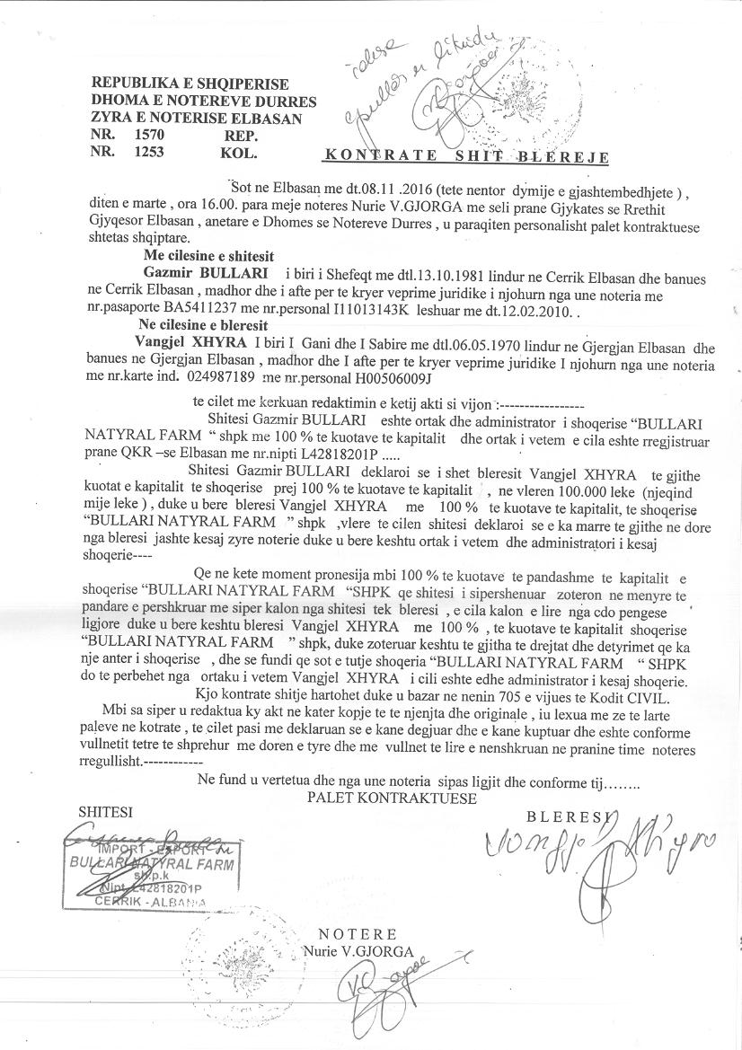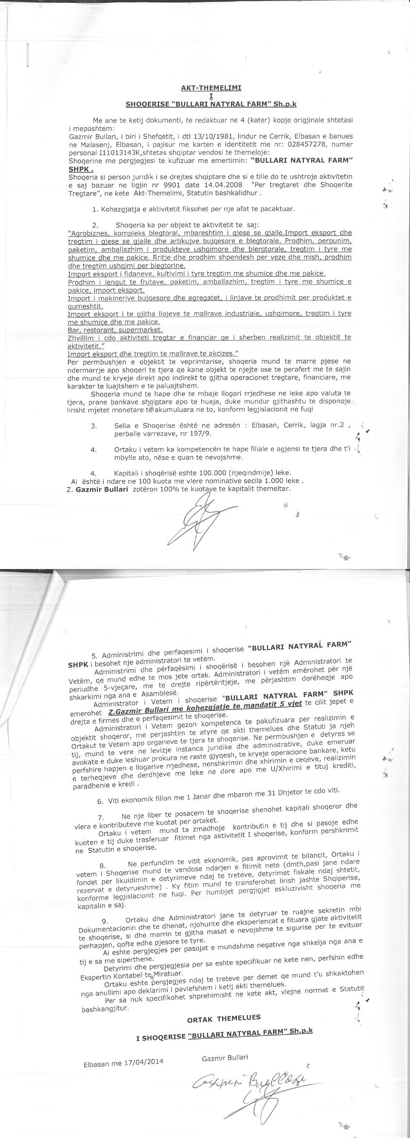 | Objekti i Veprimtarisë: | Agrobiznes, kompleks blegtoral, mbareshtim i gjese se gjalle. Import eksport dhe tregtim i gjese se gjalle dhe artikujve bujqesore e blegtorale. Prodhim, perpunim, paketim, amballazhim i produkteve ushqimore dhe blegtorale, tregtim i tyre me shumice dhe me pakice. Rritje dhe prodhim shpendesh per veze dhe mish, prodhim dhe tregtim ushqimi per blegtorine. Import eksport i fidaneve, kultivimi i tyre tregtim me shumice dhe me pakice. Prodhim i lengut te frutave, paketim, amballazhim, tregtim i tyre me shumice e pakice, import eksport. Import i makinerive bujqesore dhe agregatet, i linjave te prodhimit per produktet e qumeshtit. Import eksport i te gjitha llojeve te mallrave industriale, ushqimore, tregtim i tyre me shumice dhe me pakice. Bar, restorant, supermarket. Zhvillim i cdo aktiviteti tregtar e financiar qe i sherben realizimit te objektit te aktivitetit. Import eksport dhe tregtim te mallrave te akcizes. Ripopullim dhe peshkim. Prodhim, perpunim, shperndarje me shumice e pakice te ushqimeve per njerez me origjine shtazore. Prodhim, perpunim, shperndarje me shumice e pakice e ushqimeve per kafshe qe perdoren per ushqim. Shitje me shumice e pakice e ushqimeve me origjine shtazore. |