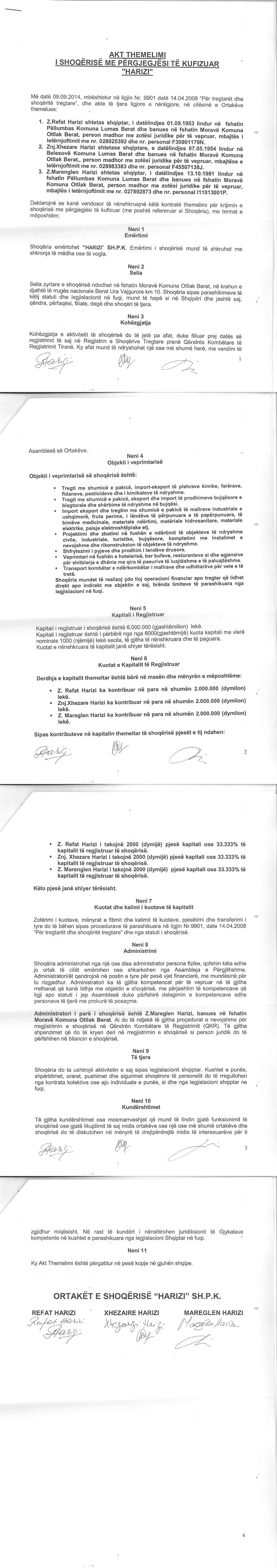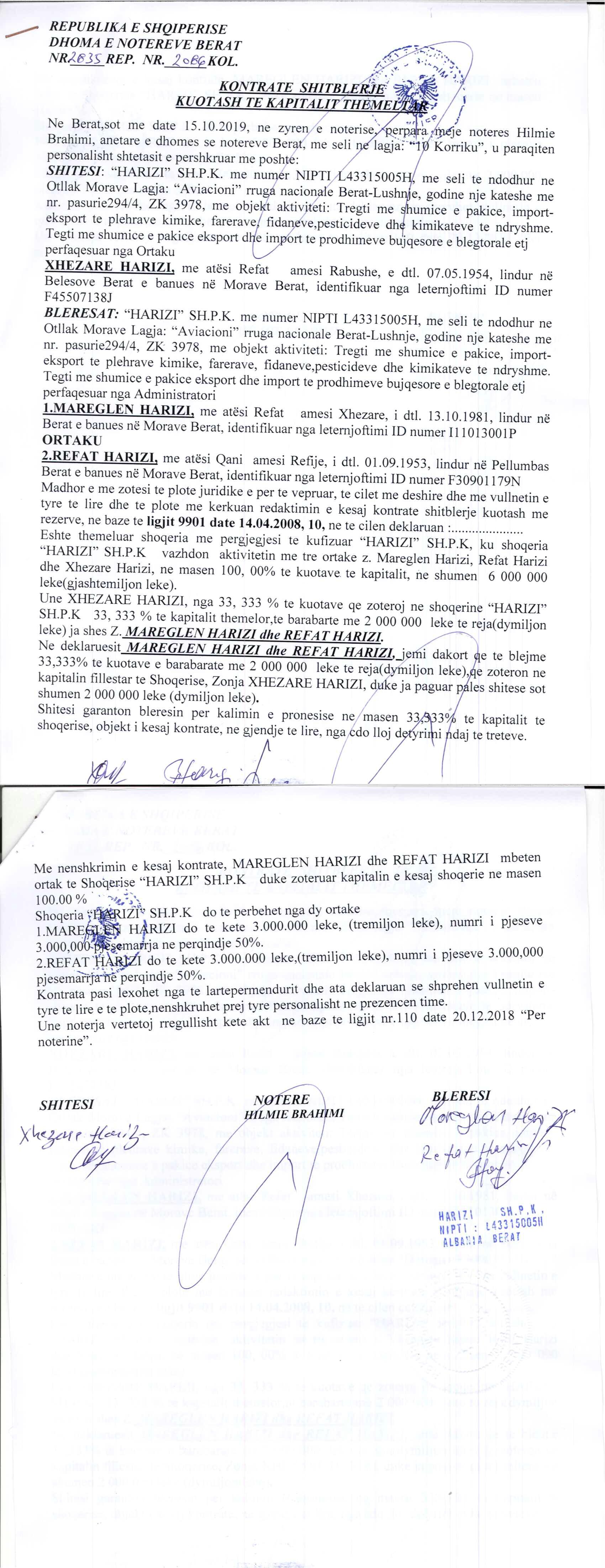 shoqëria "Harizi" shpk me NIPT L43315005H me qëllim mostjetërsimin e tyre si dhe