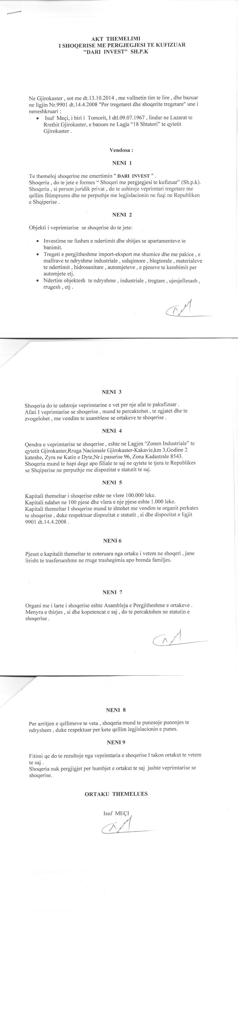 | Çështje Ligjore: | I. Me date 16/12/2022, me ane te Urdhërit të Përmbaruesit Gjyqësor Privat Altin Vako, me Nr. 1420 Prot., Nr. 1790 Dosje, datë 12.12.2022 u urdherua vendosja e mases se sekuestros konservative mbi te gjitha aksionet e zoteruara nga Isuf Meçi, prane shoqerise DARI INVEST sh.p.k me NIPT- L43416602E.” II. Me date 27/12/2022, me ane te Urdherit Nr. 1457 Prot, Nr. 1790 Dosje, date 20.12.2022, lëshuar nga Permbarues Gjyqesor Privat Altin Vako , u urdherua zhbllokimi i aksioneve apo kredive te shoqerise “DARI INVEST” shpk me NIPTL43416602E, vendosur me ane te te shkreses Nr.1420 Prot, date 12.12.2022.” |