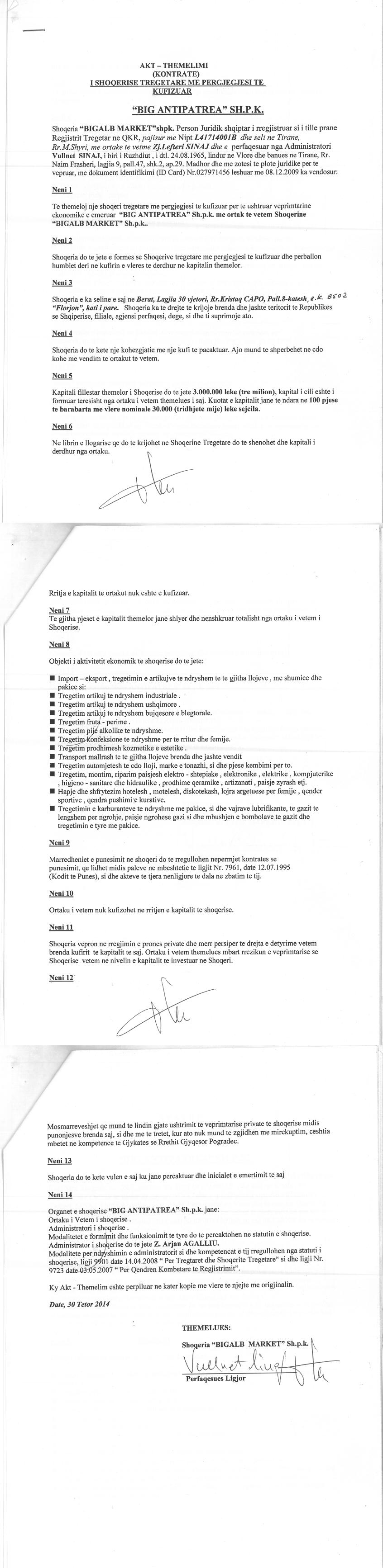 | Shënime: | Kompetencat e Administratorit: Administratori i shoqerise nuk ka ate drejte dhe kompetence per te nenshkruar kontrata apo cdo lloj mareveshje qe ne nje menyre apo tjeter ka lidhje me veprimtari fitimprurese qe buron nga pasuria e shtetit ose pushtetit vendor dhe as te fitojne pasuri te ketyre. |