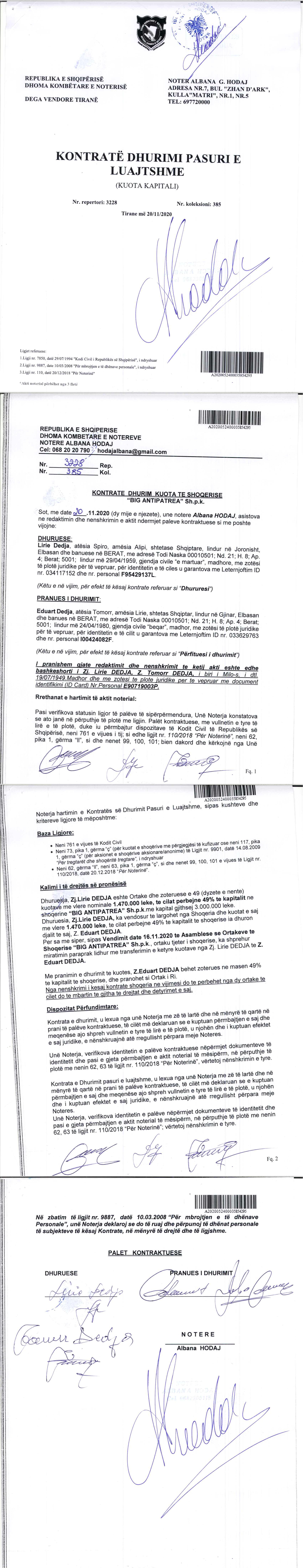 | Shoqëri Mëmë / Zotërues për këtë Subjekt: | “BIGALB GROUP”, shoqëri me përgjegjësi të kufizuar, e themeluar më datë 17/03/2011, sipas ligjeve të Republikës së Shqipërisë, me numër identifikimi në regjistrin tregtar NIPT L11521002M, me adresë në aktuale në Tirane Vaqarr GROPAJ Fshati Gropaj, Godina Tirana Cash & Carry, Kati 2, Vaqarr, dhe me administrator Elona Koshi. Ortak i vetëm i shoqërisë është Vullnet Sinaj (zoterues pasiv), zotërues për 100% të kapitalit. (Sipas të dhënave të QKB deri më datë 28.08.2024) Sipas Ekstraktit Historik te Regjistrit te Pronarit Perfitues, depozituar në QKB date 29.06.2021, terhequr datë 28.08.2024, Pronaret perfitues te subjektit “BIG ANTIPATREA”, zoterues te 25% te kapitalit e me teper, janë: Vullnet Sinaj, shtetas shqiptar, i datelindjes 1965, pronar perfitues per 51% te pronesise pasi zoteron 100% te kapitalit të “BIGALB GROUP” shpk – shoqëri mëmë për 51% te “BIG ANTIPATREA”. Data e percaktimit si pronar perfitues është 29.05.2017. Eduart Dedja, shtetas shqiptar, i datelindjes 1980, pronar perfitues per 49% te pronesise në formë direkte. Data e percaktimit si pronar perfitues është 16.11.2020. |