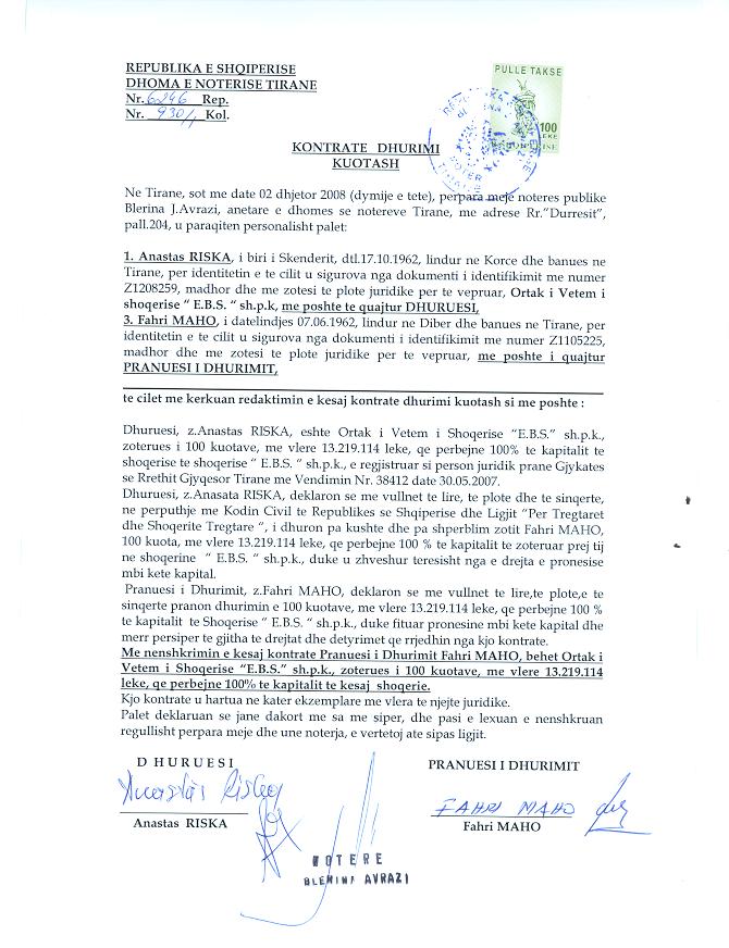 → Ekstrakt historik i regjistrit tregtar 10.02.2022 → Akti i themelimit → Kontrate dhurimi kuotash 02.12.2008 |