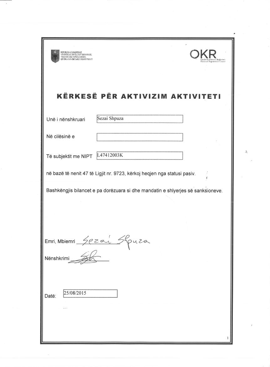 → Ekstrakt historik i regjistrit tregtar 04.10.2021 → Kerkese per heqje nga stutusi i pezulluar date 25.08.2015 |