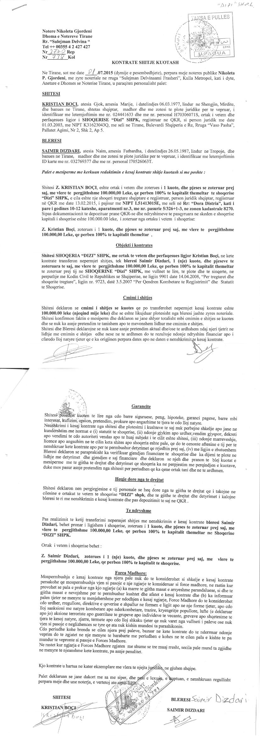“DIZI” SHPK me NIPT L51413015E, themeluar më datë 13.02.2015, me administrator të