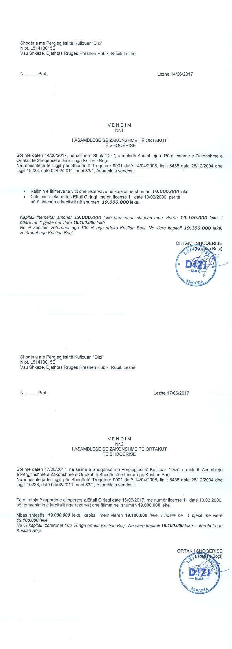 → Ekstrakt historik i regjistrit tregtar date 07.12.2021 → Akti i themelimit → Vendimi i asamblese se ortakeve per zmadhimin e kapitalit date 14.06.2017 → Kontrate shitje kuotash date 21.10.2015 → Kontrate shitje kuotash date 01.07.2015 → Vendimi i asamblese se ortakeve per zvogelimin e kapitalit date 29.06.2019 → Ekstrakt Historik i Regjistrit Tregtar date 11.01.2025 |