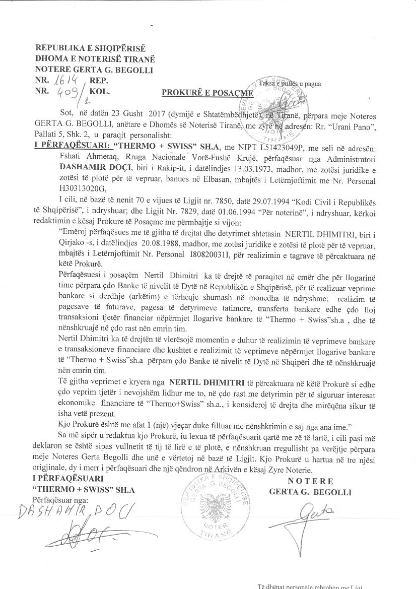 | Çështje Ligjore: | I.Me date 23.08.2017, eshte nenshkruar Prokura e Posacme, nr.1614rep., nr. 409/1 kol, leshuar nga Dashamir Doçi I cili emeron si perfaqesues te posacem Nertil Dhimitri me tagra perfaqesimi sipas kesaj prokure. II.Me date 27.04.2019, eshte nenshkruar Marreveshja e Barres Siguruese, Nr. 970 Rep., Nr. 430, lidhur midis Barremasit:“Raiffeisen Bank sha”, Barredhenesit: shoqerine DAST(Delta Adhesive Structural Tech) sha, Dashamir Doçi, Oltion Kabashi, Bledar Kabashi, Kredimarresit “THERMO + SWISS” SHA. |