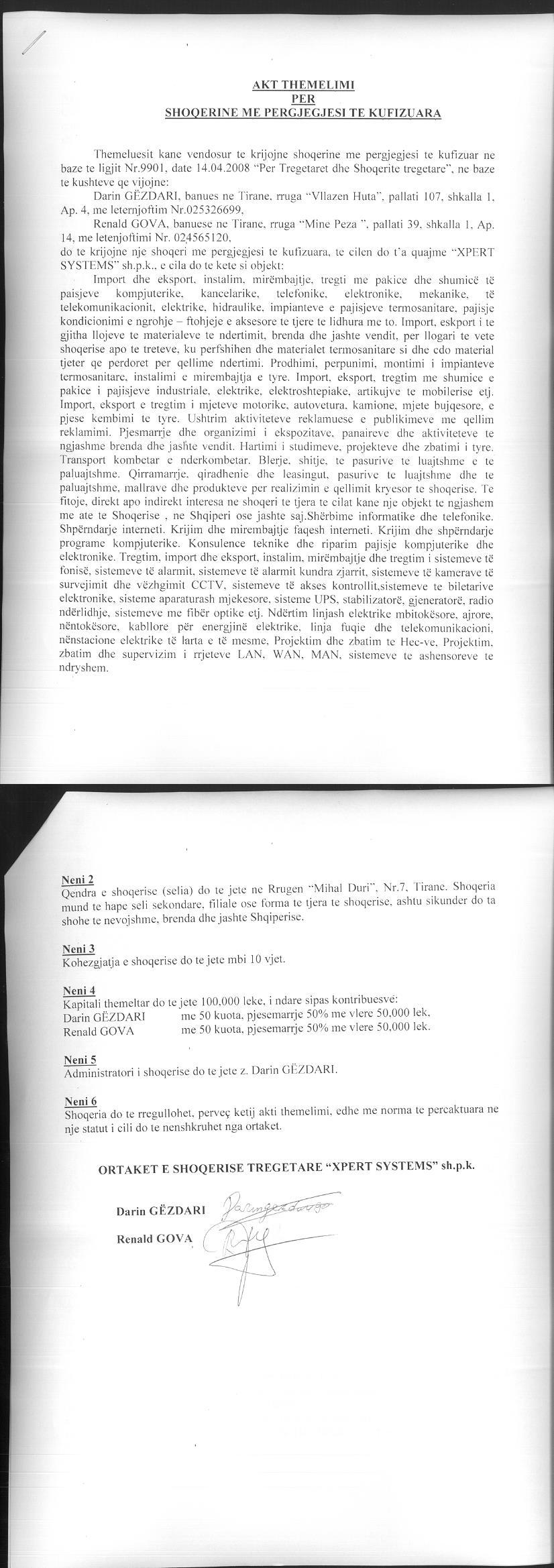 → Ekstrakti Historik i Regjistrit Tregtar date 16.11.2021 → Akti i themelimit → Kontrate date 14.07.2016 → Kontrate date 18.10.2017 → Kontrate e Shitjes se Kuotave date 01.03.2021 → Ekstrakt historik i regjistrit tregtar date 04.08.2025 |