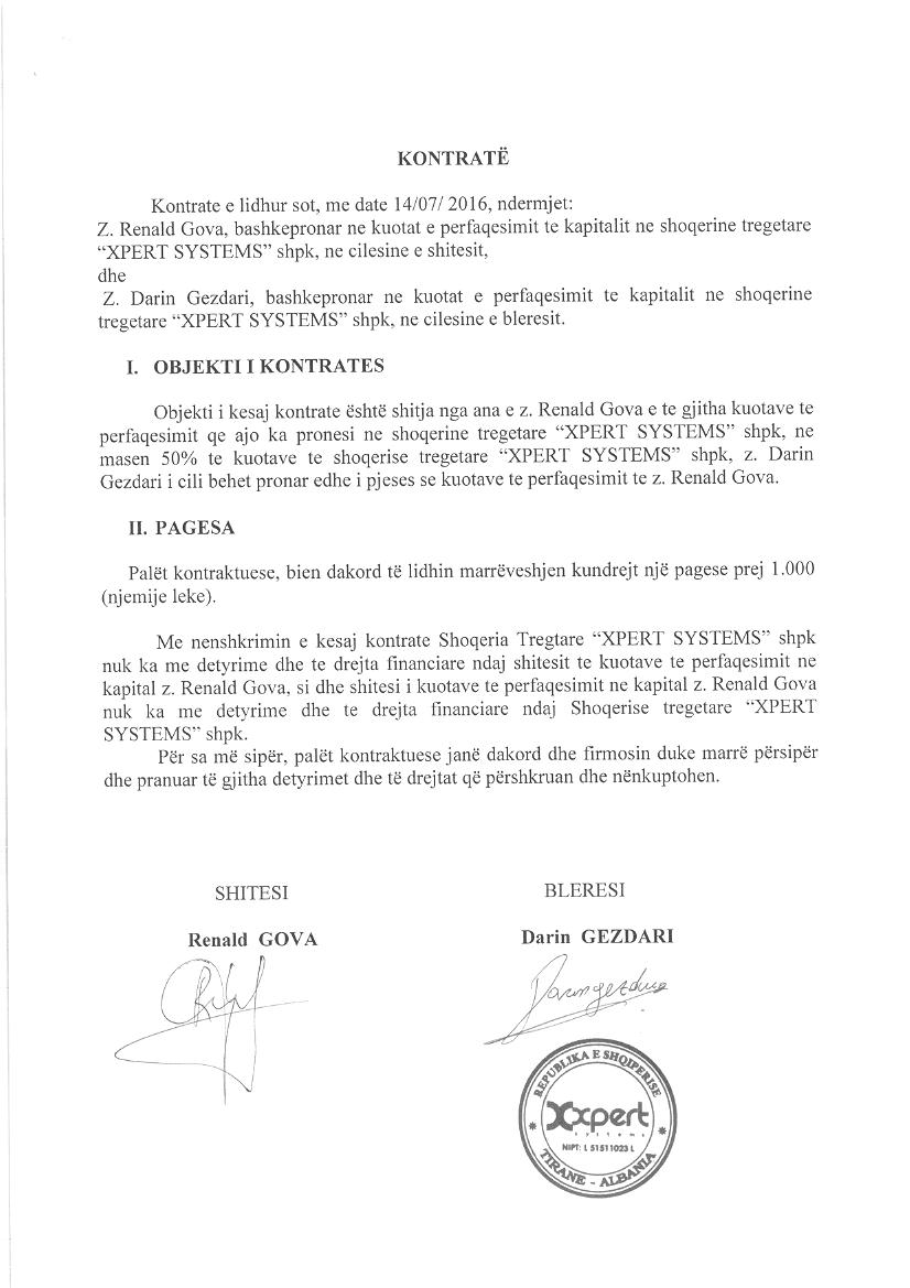 | Çështje Ligjore: | I. Sipas Urdherit te lëshuar date 05.08.2020, eshte vendosur: masa e sekuestros konservative në kuotat /aksionet e pales debitore , si dhe mbi të drejtat që rrjedhin nga zotërimi I këtyre kuotave duke ndaluar tjetërsimin dhe /oser disponimin e tyre si dhe mos kryerjen e asnjë veprimi tjetër I cili mund të ndryshojë të dhënat në regjistrin tregtar. Debitor Shoqëria “XPERT SYSTEMS” SHPK me Nipt L51511023L. Dokumenti do të qëndrojë I bllokuar deri në urdhër të dytë. II. Sipas Urdherit te lëshuar date 06.08.2020, eshte vendosur: zhbllokimi nga masa e sekuestros konservative kuotat/aksionet e pales debitore shoqëria" XPERT SYSTEMS", të bllokuara me anë të shkresës Nr.6882 Prot, datë 05.08.2020. III. Sipas shkresës Nr. 13037 Prot., datë 15.10.2021 për Vendosjen e Masës së Sigurimit të Detyrimit Tatimor, lëshuar nga Drejtoria e Përgjithshme e Tatimeve, Rajoni Qëndror, u kerkua te mos lejohet tjetërsimi mbi pasurinë dhe të drejtat pasurore që i përkasin “XPERT SYSTEMS” shpk, me NUIS(NIPT)- L51511023L. IV. Sipas shkresës Nr.6070 Prot, datë 31.03.2022 “kërkesë për lirimin e masës së sigurimit të detyrimit tatimor”, i Drejtorisë së Përgjithshme të Tatimeve, Drejtoria e Mbledhjes se Detyrimeve Tatimore të Papaguara, Rajoni Qëndror, u kerkua lirimi i masës së sigurimit mbi subjektin XPERT SYSTEMS” shpk, me NUIS(NIPT)- L51511023L. |