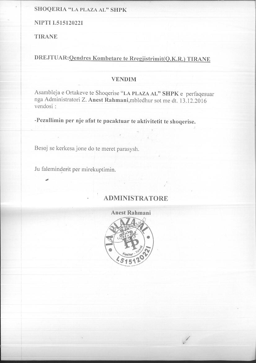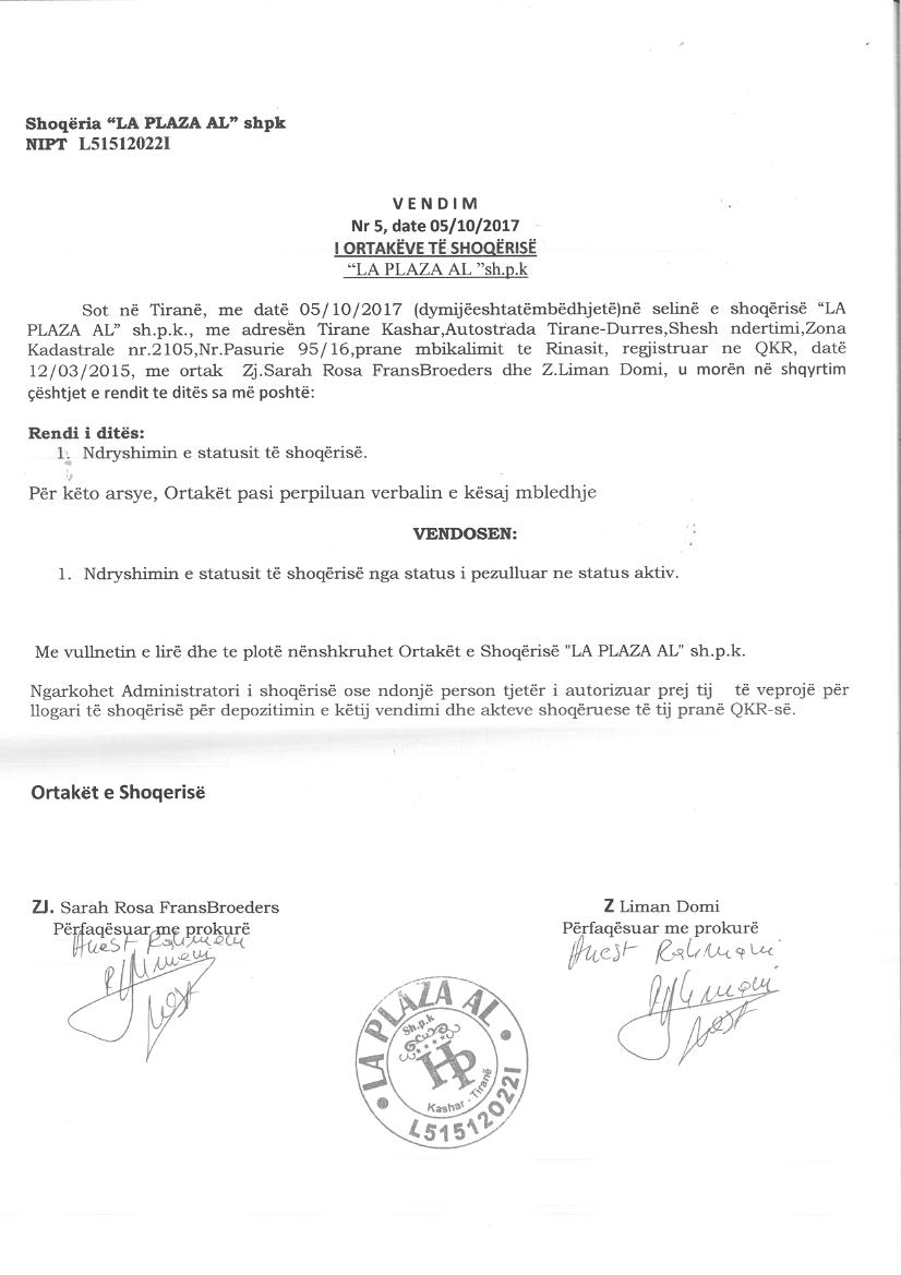 | Çështje Ligjore: | I. Më datë 13.12.2016, me vendim të asamblesë së ortakëve, u pezullua aktiviteti i shoqërisë për një afat të pacaktuar. Statusi ndryshoi nga “Aktiv” në “Pezulluar”. II. Më datë 05.10.2017, me vendim të asamblesë së ortakëve, u aktivizua veprimtaria e shoqërisë. Statusi i shoqërisë ndryshoi nga “Pezulluar” në “Aktiv”. |