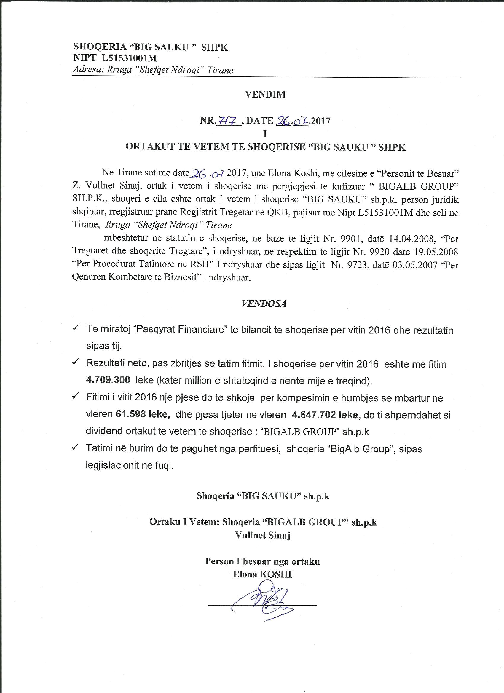 | Çështje Ligjore: | Me datë 12.05.2017, me Vendim Nr. 5/1 të Asamblesë së Zakonshme, u vendos që Shoqeria nuk do te kryeje asnje veprimtari fitimprurese qe buron nga pasuria e shtetit ose pushteti vendor dhe as te fitoje pasuri te ketyre , me qellim zbatimin me korrektesi te pikes 3 te nenit 70 te Kushtetutes se Republikes se Shqiperise. Administratori i shoqerise nuk ka te drejte dhe kompetence per te nenshkruar kontrata apo cdo lloji mareveshje qe, ne nje menyre apo tjeter, ka lidhje me veprimtari fitimprurese qe buron nga pasuria e shtetit ose pushtetit vendor dhe as te fitoje pasuri te ketyre. |