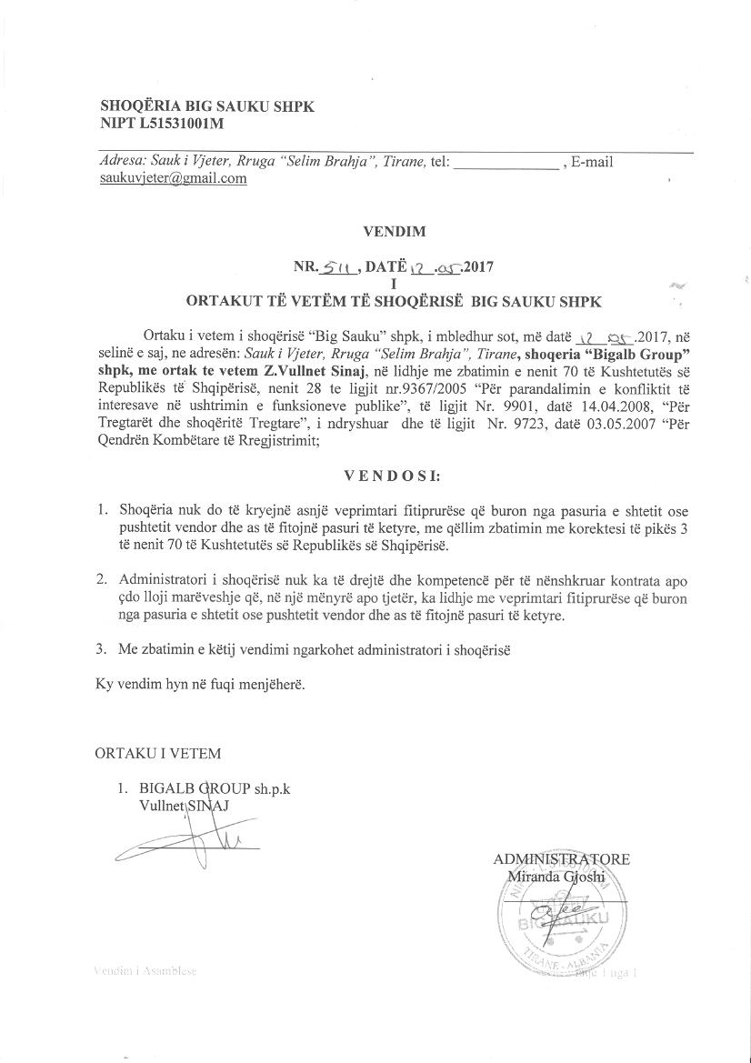| Shënime: | Kompetencat e Administratorit: Administratori I shoqerise nuk ka te drejte dhe kompetence per te nenshkruar kontrata apo cdo lloj mareveshje qe ne nje menyre apo tjeter ka lidhje me veprimtari fitimprurese qe buron nga pasuria e shtetit ose pushtetit vendor dhe as te fitojne pasuri te ketyre. |