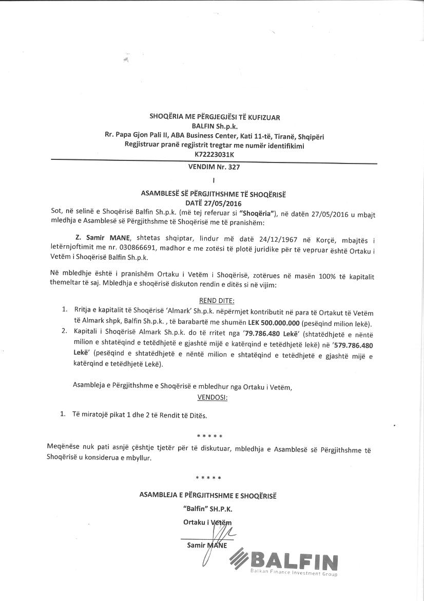 | Shënime: | Kompetencat e Administratorit: Shtohet si kompetencë e administratorit, pajisja me kartë krediti biznesi me vlerë maksimale prej 10,000 (dhjetë mijë) Euro ku specifikohet: -të kryejë veprimet e nevojshme në institucionet bankare përkatëse për pajisjen me kartë/ta krediti biznesi për nevojat e përditshme të Shoqërisë. Administrator/ët mund të vendosin që më shumë se një person nga Shoqëria të pajiset më kartë krediti biznesi. Në çdo rast, limiti i kreditimit në agregat do të jetë i kufizuar në vlerën maksimale prej 10,000 (dhjetë mijë) Euro Gjithashtu, shihet e nevojshme qartësimi i kufizimit të kompetencave të Administratorit, sikurse parashikohet në Nenin 11.2 shkronja a), duke specifikuar se nga kufizimi monetar prej pesë milion lekë përjashtohen rastet e shitjes dhe blerjes së mallrave me qëllim përmbushjen e objektit të veprimtarisë së Shoqërisë. Për rrjedhojë, Neni 11.2, shkronja a) riformulohet si më poshtë, duke shtuar rastet e përjashtimit: -të kryejë blerjet, shitjet, nënshkrimin e kontratave me palë të treta për mallra, punë, shërbime apo çdo lloj marrëdhënie tjetër e cila nuk është nën përgjegjësinë direkte të Asamblesë së Përgjithshme deri në vlerën e barabartë me 5.000.000 ALL (pesë milion lekë), për çdo transaksion apo në agregat, duke përjashtuar këtu shitjen dhe blerjen e mallrave që stokohen/tregtohen nga Shoqëria në kuadër të përmbushjes së objektit parësor të veprimtarisë të saj. Mbi këtë vlerë e deri në 50.000.000 ALL (pesëdhjetë milion lekë) do të merret miratimi i Zëvendës Presidentit të Balfin – Balkan Finance Investment Group SH.P.K Të shtohet si kompetencë e administratorit, pajisja me kartë krediti biznesi me vlerë maksimale prej 10,000 (dhjetë mijë) Euro nga ku shtohet në Statutin e Shoqërisë “Spar Albania” paragrafi si mëposhtë: a-të kryejë veprimet e nevojshme në institucionet bankare përkatëse për pajisjen me kartë/ta krediti biznesi për nevojat e përditshme të Shoqërisë. Administrator/ët mund të vendosin që më shumë se një person nga Shoqëria të pajiset më kartë krediti biznesi. Në çdo rast, limiti i kreditimit në agregat do të jetë i kufizuar në vlerën maksimale prej 10,000 (dhjetë mijë) Euro Gjithashtu, shihet e nevojshme qartësimi i kufizimit të kompetencave të Administratorit, sikurse parashikohet në Nenin 11.2 shkronja a), duke specifikuar se nga kufizimi monetar prej pesë milion lekë përjashtohen rastet e shitjes dhe blerjes së mallrave me qëllim përmbushjen e objektit të veprimtarisë së Shoqërisë. Për rrjedhojë, Neni 11.2, shkronja a) riformulohet si më poshtë, duke shtuar rastet e përjashtimit: të kryejë blerjet, shitjet, nënshkrimin e kontratave me palë të treta për mallra, punë, shërbime apo çdo lloj marrëdhënie tjetër e cila nuk është nën përgjegjësinë direkte të Asamblesë së Përgjithshme deri në vlerën e barabartë me 5.000.000 ALL (pesë milion lekë), për çdo transaksion apo në agregat, duke përjashtuar këtu shitjen dhe blerjen e mallrave që stokohen/tregtohen nga Shoqëria në kuadër të përmbushjes së objektit parësor të veprimtarisë të saj. Mbi këtë vlerë e deri në 50.000.000 ALL (pesëdhjetë milion lekë) do të merret miratimi i Zëvendës Presidentit të Balfin – Balkan Finance Investment Group SH.P.K. |