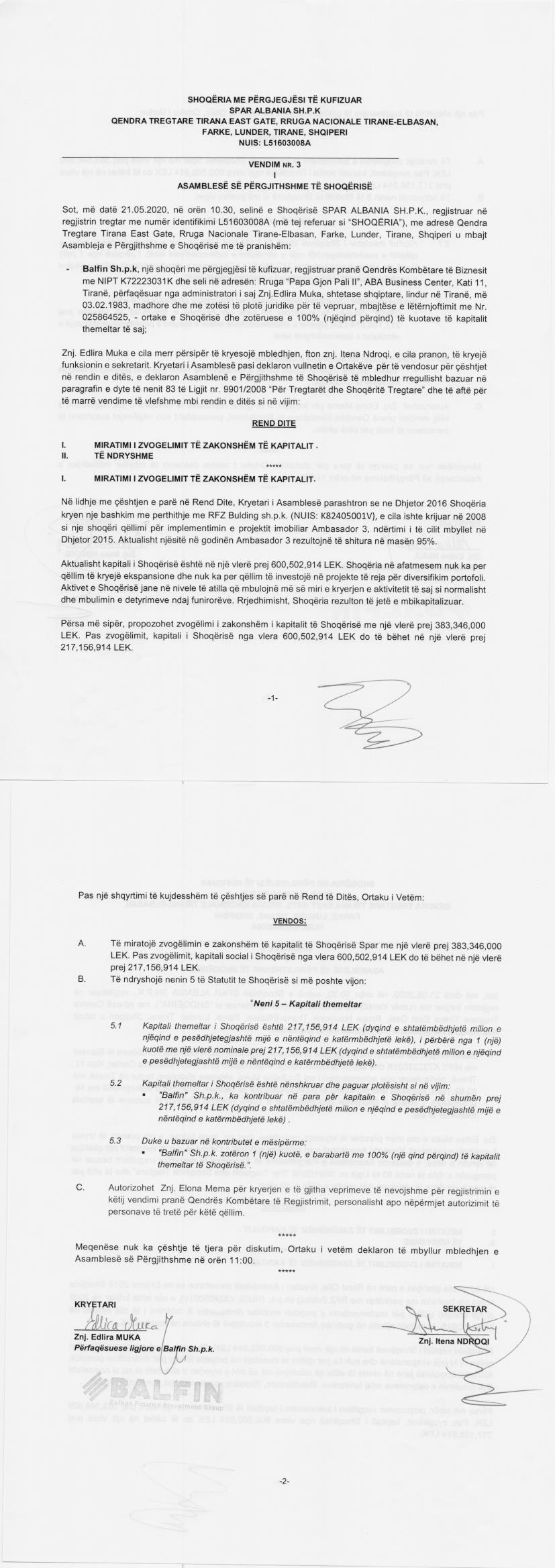 → Ekstrakt Historik i Regjistrit Tregtar date 11.10.2023 → Akt themelimi dhe Statuti i Shoqerise → Vendim i Asamblesë së Përgjithshme, Zmadhim Kapitali datë 10.04.2015 → Vendim i Asamblesë së Përgjithshme, Zmadhim Kapitali datë 22.07.2015 → Vendim i Asamblesë së Përgjithshme, Zmadhim Kapitali datë 27.05.2016 → Vendim i Asamblesë së Përgjithshme, Bashkimi me Përthithje datë 06.10.2016 → Marrëveshje për Bashkimin me Përthithje të Shoqërive "Spar Albania" dhe "RFZ Building" datë 06.12.2016 → Projekt Marrëveshje Bashkimi midis Shoqërive "Spar Albania" dhe "Spar Elbasan" date 23.09.2018 → Marrëveshje Bashkimi ndërmjet Shoqërive "Spar Albania" me "Spar Elbasan" datë 20.11.2018 → Vendim i Asamblesë së Përgjithshme, Zvogëlim Kapitali datë 26.04.2019 → Vendim i Asamblesë së Përgjithshme, Zvogëlim Kapitali datë 21.05.2020 → Vendim i Asamblesë së Përgjithshme, Zvogëlim Kapitali datë 15.11.2021 → Vendim i Asamblesë së Përgjithshme, Zvogëlim Kapitali datë 25.03.2022 → Ekstrakt Historik i Regjistrit te Pronareve Perfitues date 11.10.2023 → Ekstrakt Historik i Regjistrit Tregtar date 25.09.2024 → Ekstrakt Historik i Regjistrit te Pronareve Perfitues date 25.09.2024 |
