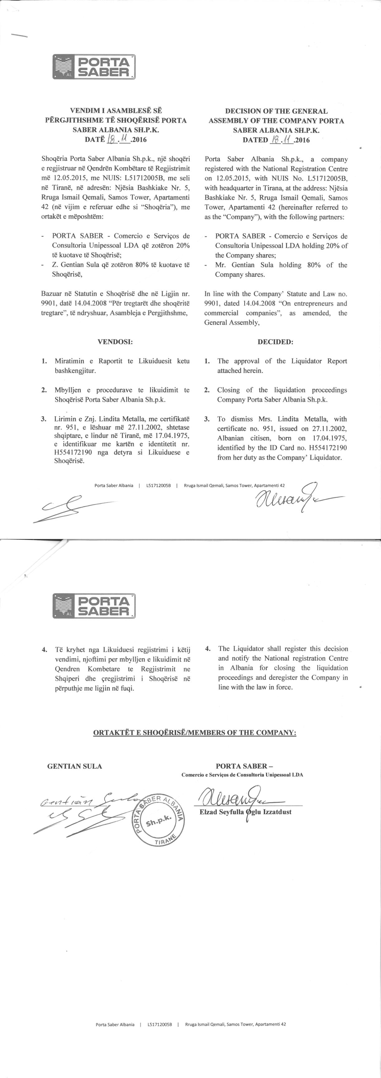 → Ekstrakt Historik i Regjistrit Tregtar date 20.02.2025 → Statuti i Shoqerise → Vendim i Asamblesë së Ortakëve për Likuidimin e Shoqërisë datë 15.03.2016 → Vendim i Asamblesë së Ortakëve për Çregjistrimin e Shoqërisë datë 18.11.2016 |