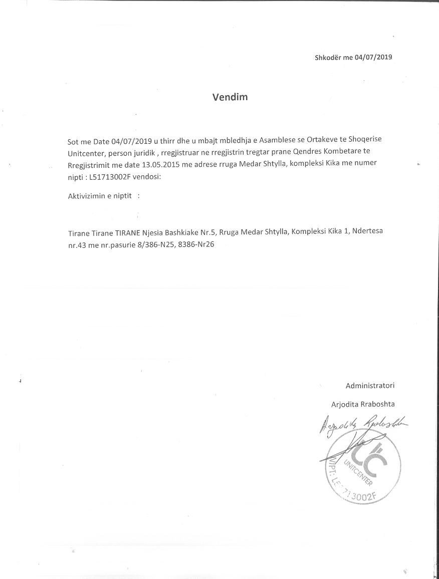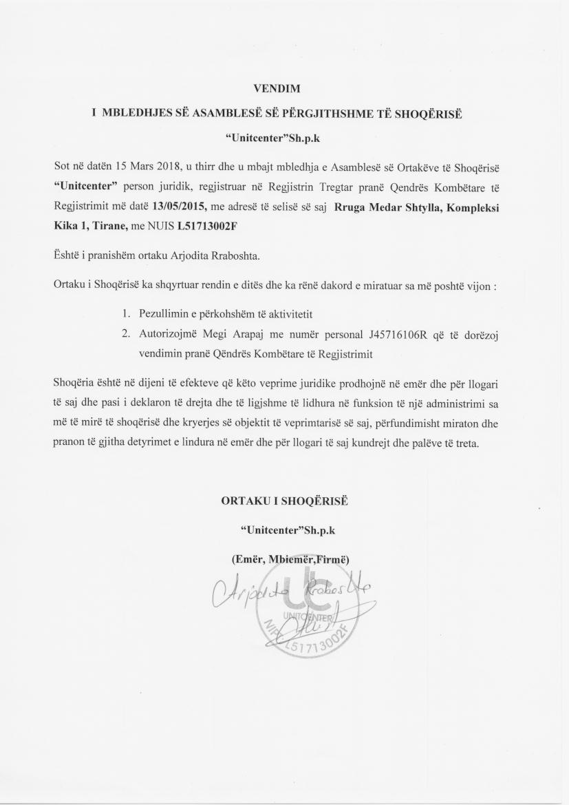→ Ekstrakt historik i regjistrit tregtar 22.06.2020 → Akti i themelimit dhe statuti i shoqerise → Kontrate per transferimin e kuotave 21.02.2018 → Vendimi i asamblese dhe kontrata e shitjes 26.08.2017 → Vendimi per pezullimin e aktivitetit 15.03.2018 → Vendimi per riaktivizimin e shoqerise 04.07.2019 |