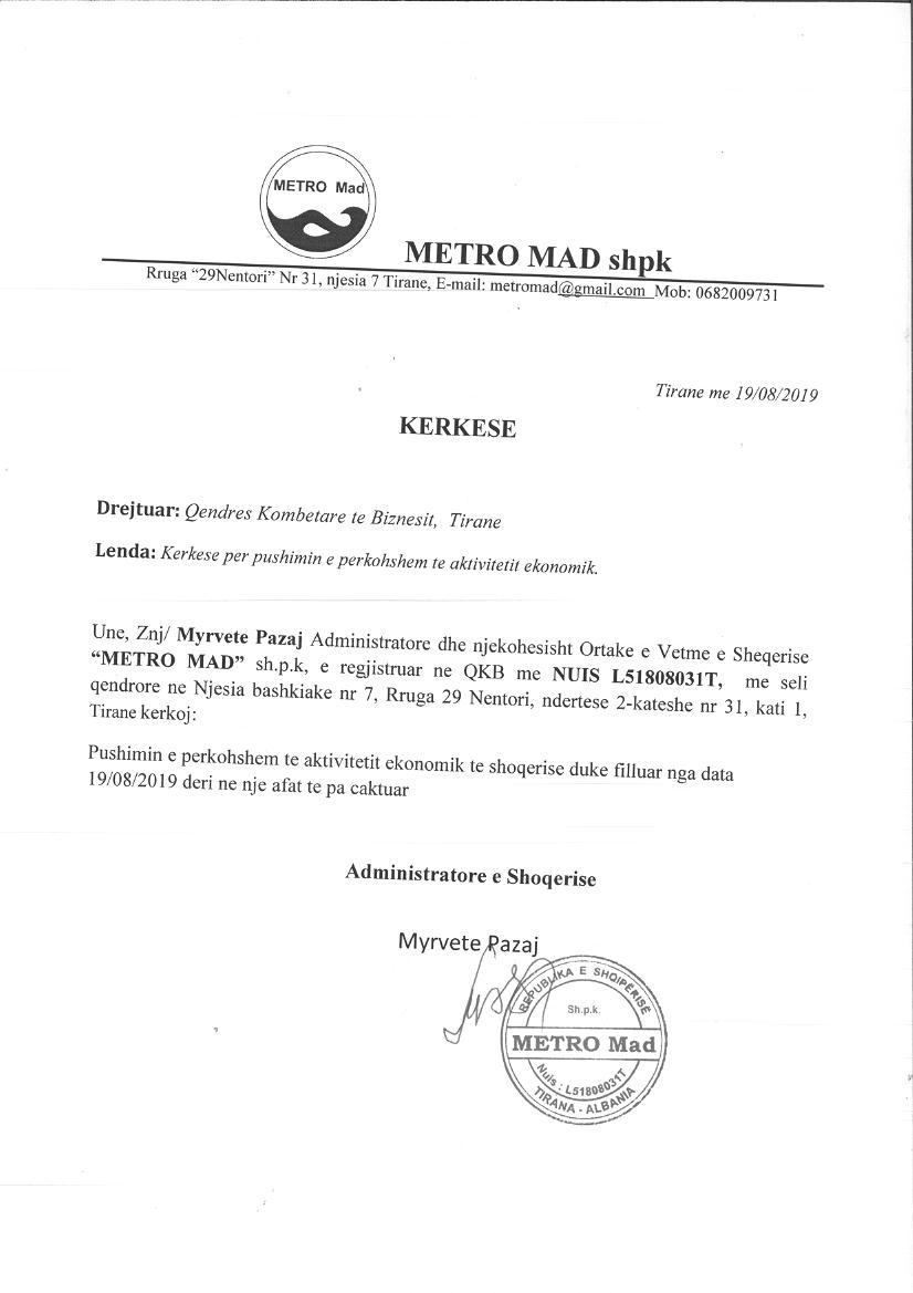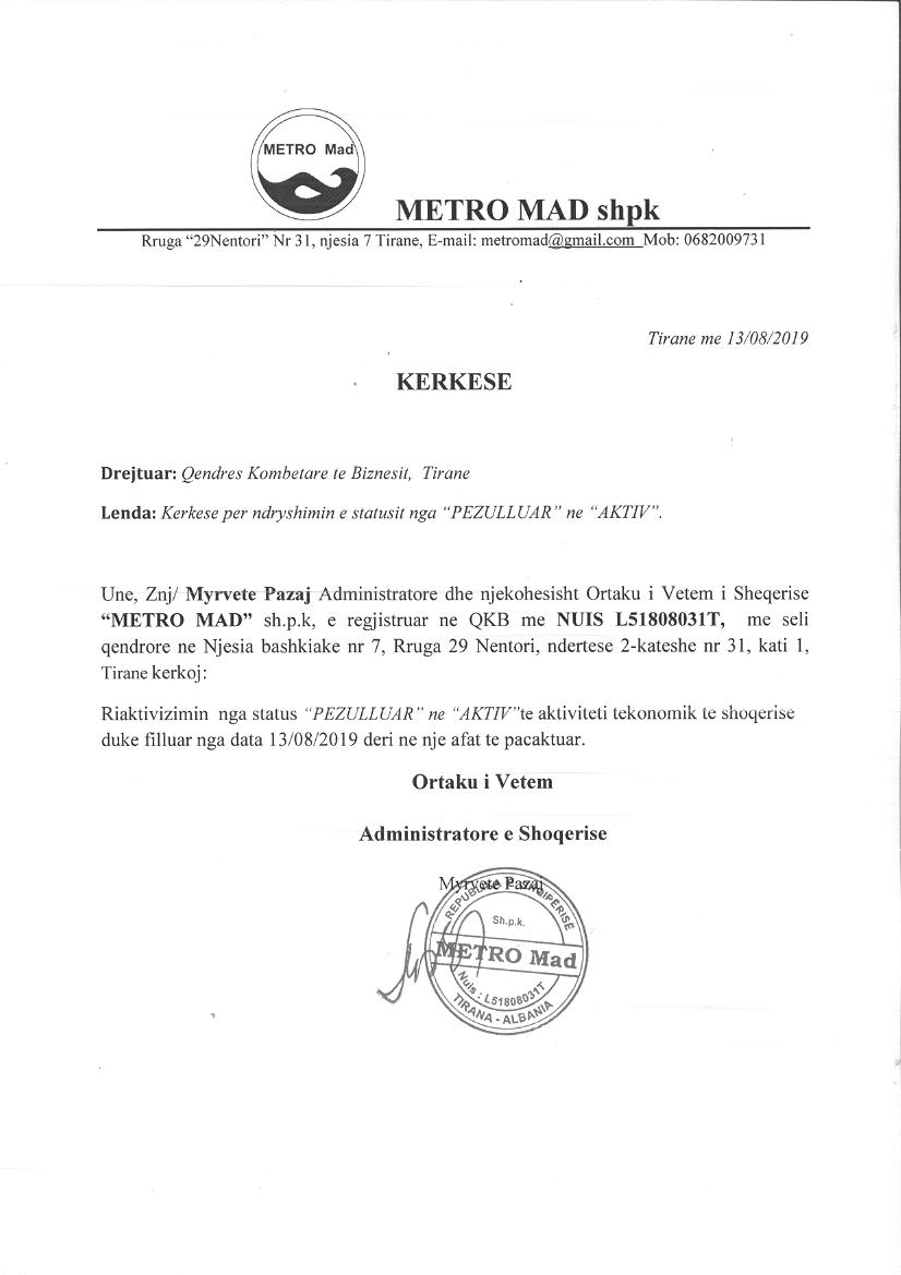 → Ekstrakt historik i regjistrit tregtar date 18.11.2021 → Statuti i shoqerise → Kerkese e administratore per aktivizimin e shoqerise, date 13.08.2019 → Kerkese per pushimin e perkohshem te aktivitetit date 19.08.2019 → Kerkese per pushimin e perkohshem te aktivitetit date 06.08.2019 |
