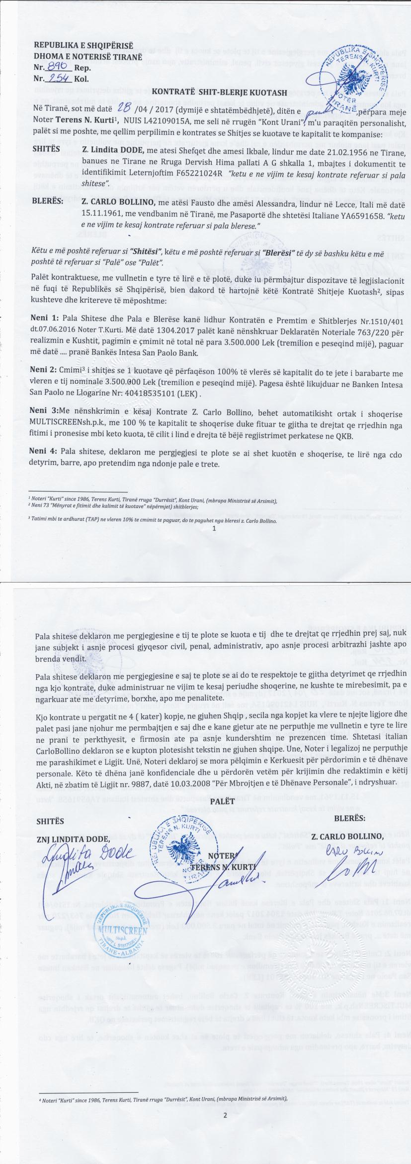→ Ekstrakt historik i regjistrit tregtar date 24.09.2022 → Akti I themelimit → Kontrate shit-blerje kuotash 28.04.2017 → Vendimi per miratimin e zmadhimit te kapitalit 28.02.2018 → VKM Nr. 642, datë 02.10.2019 per dhenien e miratimit per lidhjen e kontrates se qirase me tarifen 1 euro → VKM nr. 54, datë 05.02.2014, Për përcaktimin e kritereve, të procedurës e të mënyrës së dhënies me qira, enfiteozë apo kontratave të tjera të pasurisë shtetërore → LIGJ Nr. 37/2019 PËR DISA SHTESA NË AKTIN NORMATIV, ME FUQINË E LIGJIT, NR. 4, DATË 9.7.2008, TË KËSHILLIT TË MINISTRAVE → VKM Nr. 157, datë 19.02.2020 per miratimin e nje shtese ne kontrates se qirase me tarifen 1 euro, te datës 02.10.2019 → VKM Nr. 589, date 22.07.2020 per miratimin e nje ndryshimi ne kontraten e qirase me tarifen 1 euro → VKM Nr.368 per shembjen e objekteve te dhena me qera me tarifen 1 euro, date 06.05.2020 → Marreveshja e Barres Siguruese - Banka Amerikane e Investimeve → Marreveshje siguruese date 30.06.2022 → Ekstrakt Historik i Regjistrit Tregtar date 13.04.2023 → Ekstrakt Historik i Regjistrit Tregtar date 16.08.2023 → Ekstrakt Historik i Regjistrit Tregtar date 11.12.2023 → VKM Nr.368 per shembjen e objekteve te dhena me qera me tarifen 1 euro, date 06.05.2020 |