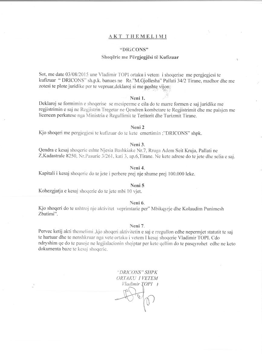 | Emërtime të tjera Tregtare: | "DRICONS"SHPK |