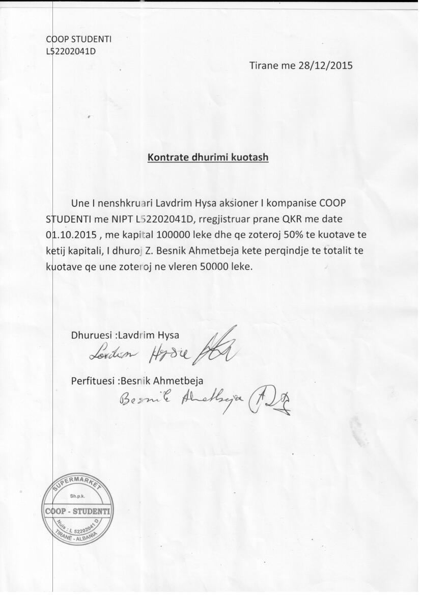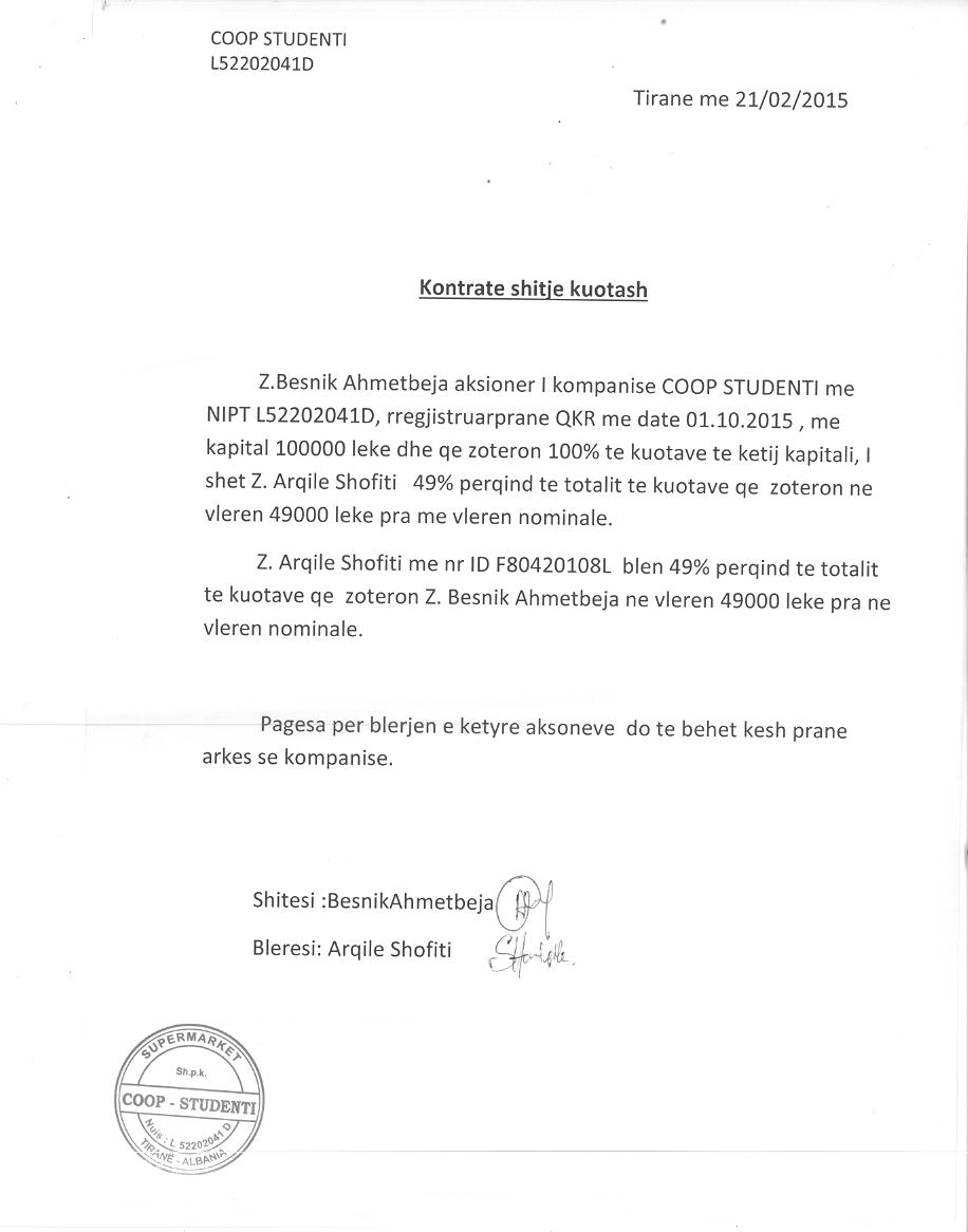 → Ekstrakt historik i regjistrit tregtar 22.11.2019 → Akti i themelimit → Kontrate dhurimi kuotash 28.12.2015 → Kontrate shitje kuotash 21.02.2015 → Kontrate dhurimi kuotash 11.03.2017 → Kontrate dhurimi kuote 09.01.2019 → Urdher per venien e sekuestros konservative 16.09.2016 → Urdher per heqjen e sekuestros konservative 08.11.2016 → Urdher per venien e sekuestros konservative 17.02.2017 → Urdher per venien e sekuestros konservative 21.02.2017 → Urdher per rivenien e sekuestros konservative 24.07.2017 → Urdher per heqjen e sekuestros konservative 25.08.2017 |