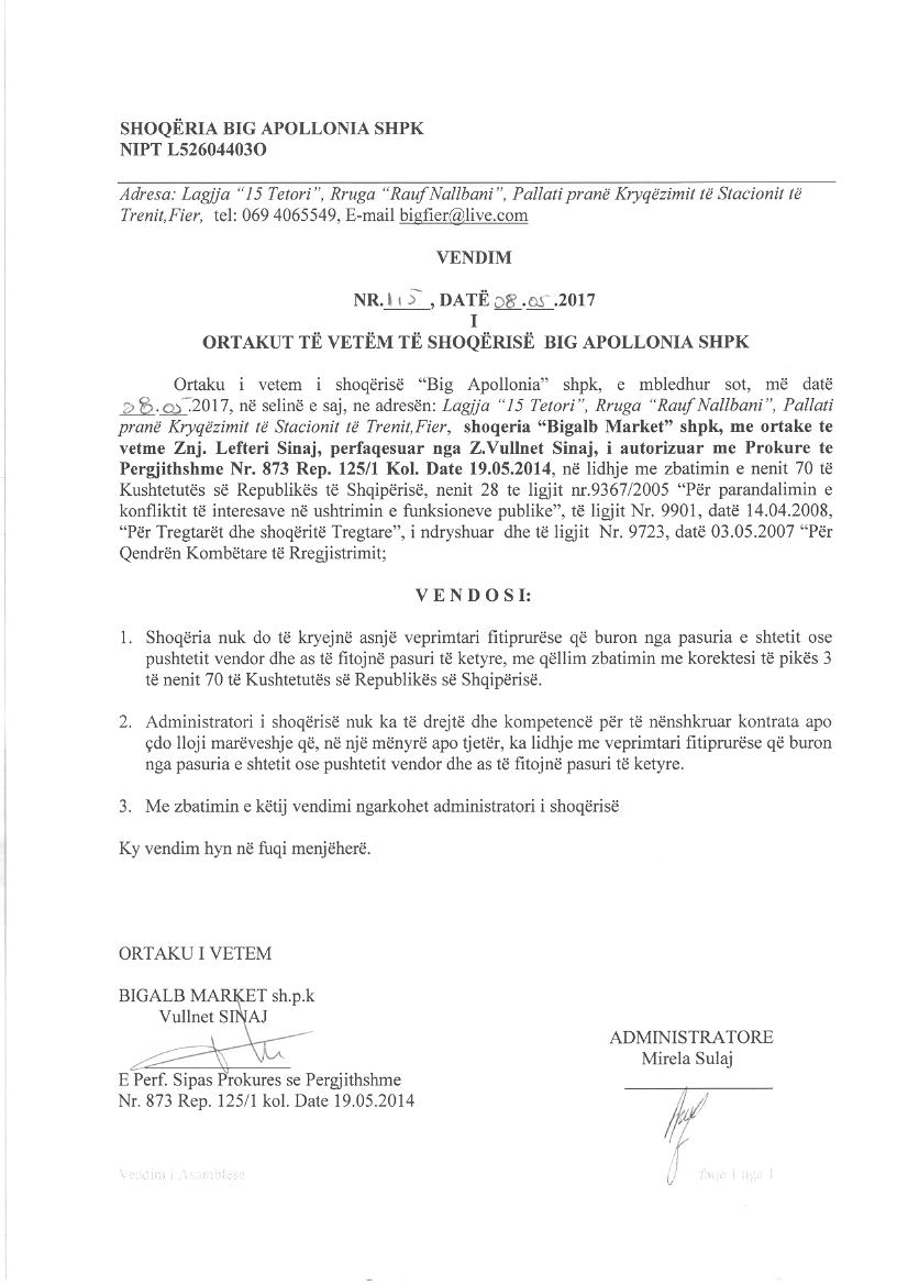 | Shënime: | Kompetencat e Administratorit: Administratori I shoqerise nuk ka te drejte dhe kompetence per te nenshkruar kontrata apo cdo lloj mareveshje qe ne nje menyre apo tjeter ka lidhje me veprimtari fitimprurese qe buron nga pasuria e shtetit ose pushtetit vendor dhe as te fitojne pasuri te ketyre. |