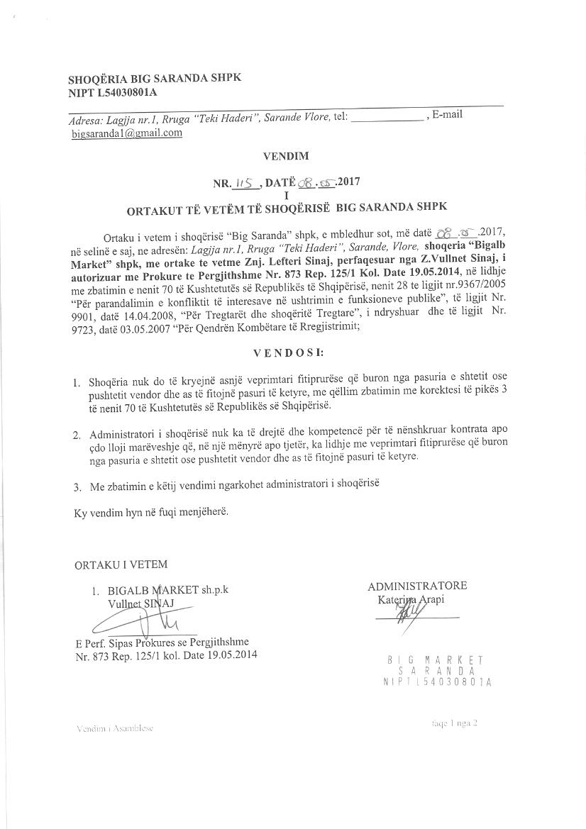 | Shënime: | Kompetencat e Administratorit: Administratori I shoqerise nuk ka te drejte dhe kompetence per te nenshkruar kontrata apo cdo lloj mareveshje qe ne nje menyre apo tjeter ka lidhje me veprimtari fitimprurese qe buron nga pasuria e shtetit ose pushtetit vendor dhe as te fitojne pasuri te ketyre. |