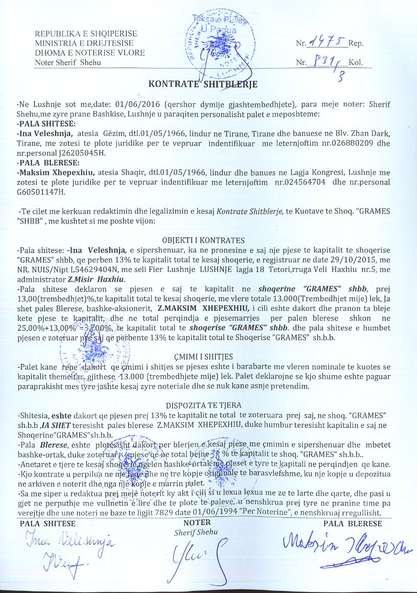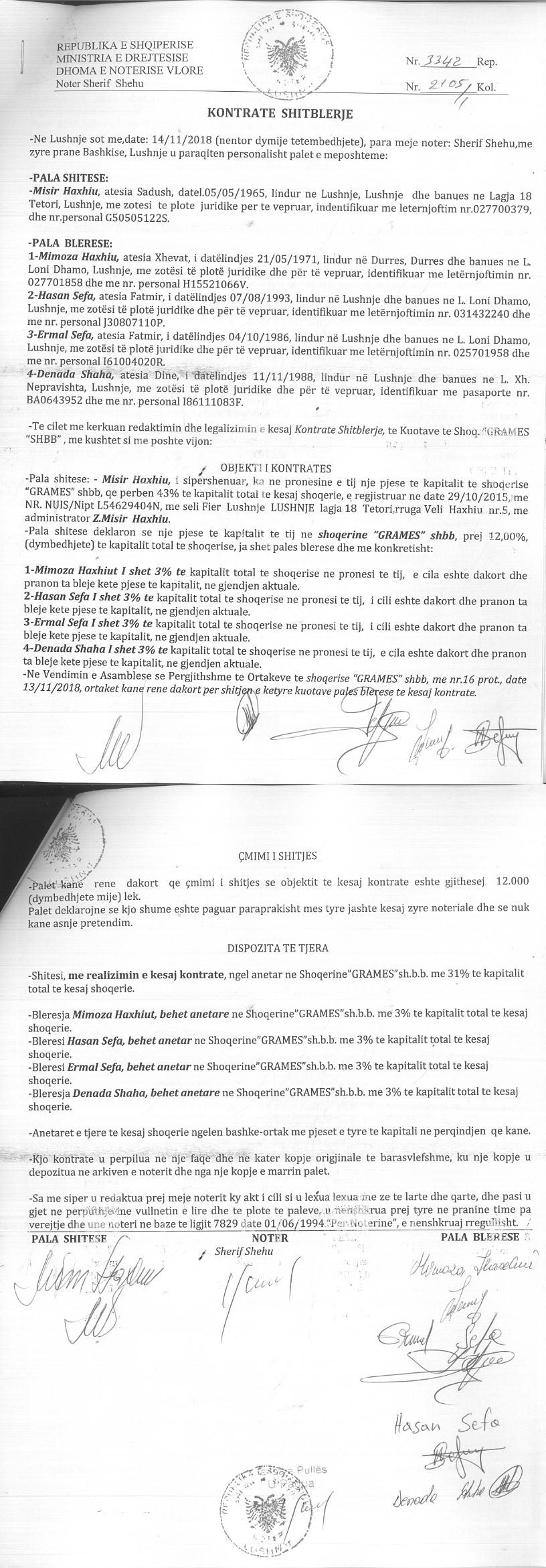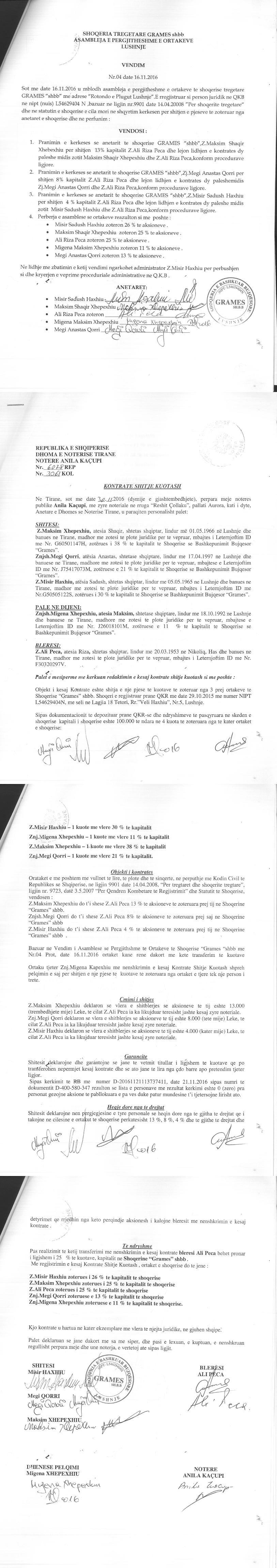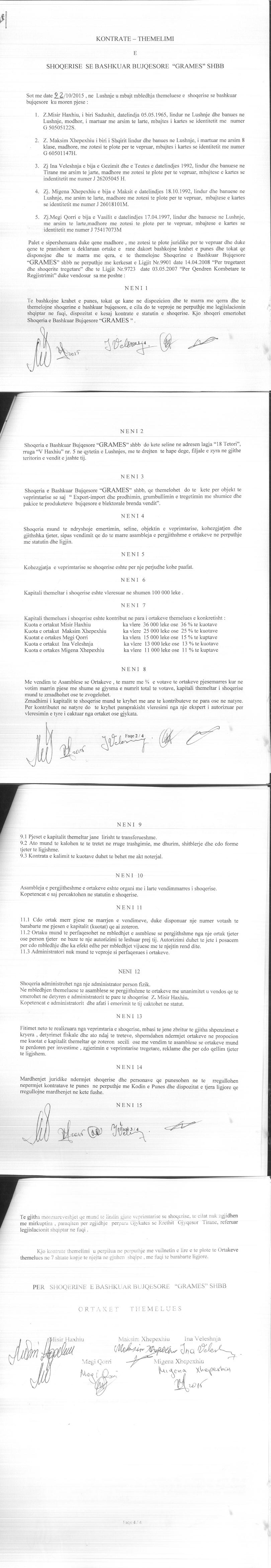 → Ekstrakt Historik i Regjistrit Tregtar date 16.10.2023 → Kontratë themelimi e Shoqërisë → Kontratë Shitblerje datë 01.06.2016 → Kontratë Shitje Kuotash datë 30.11.2016 → Kontratë Shitje Kuotash datë 13.11.2017 → Kontratë Shitblerje datë 14.11.2018 → Kontratë Shitblerje datë 06.02.2020 → Kontratë Shitblerje datë 08.02.2020 → Ekstrakt Historik i Regjistrit Tregtar date 17.04.2024 → Të dhënat e Investimit, Financimet Nga IPARD - Aksesuar nga Agjencia për Zhvillim Bujqësor dhe Rural AZHBR datë 17.04.2024 |