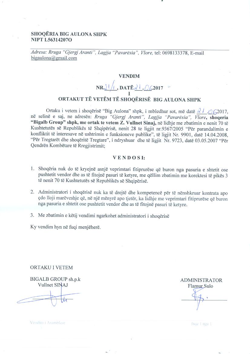 | Shënime: | Kompetencat e Administratorit: Administratori i shoqerise nuk ka te drejte dhe kompetence per te nenshkruar kontrata apo çdo lloji mareveshje qe, ne nje menyre apo tjeter, ka lidhje me veprimtari fitimprurese qe buron nga pasuria e shtetit ose pushtetit vendor dhe as te fitojne pasuri te ketyre. |