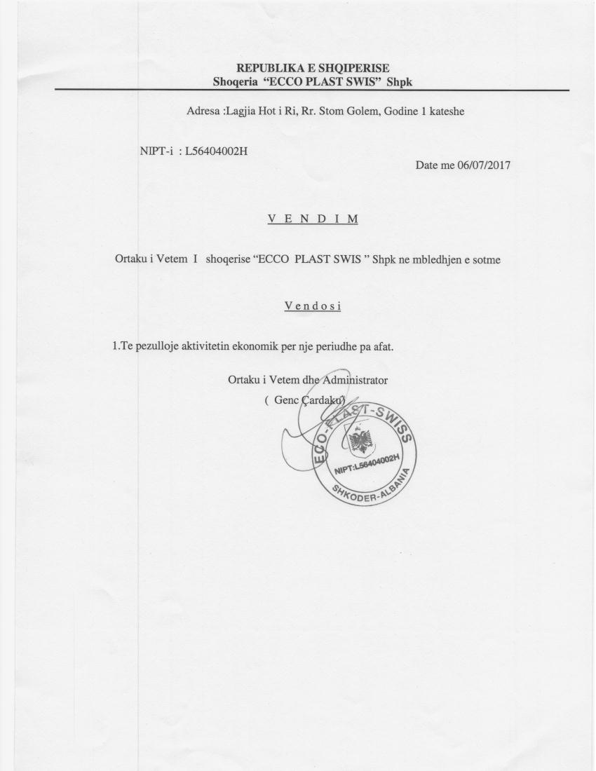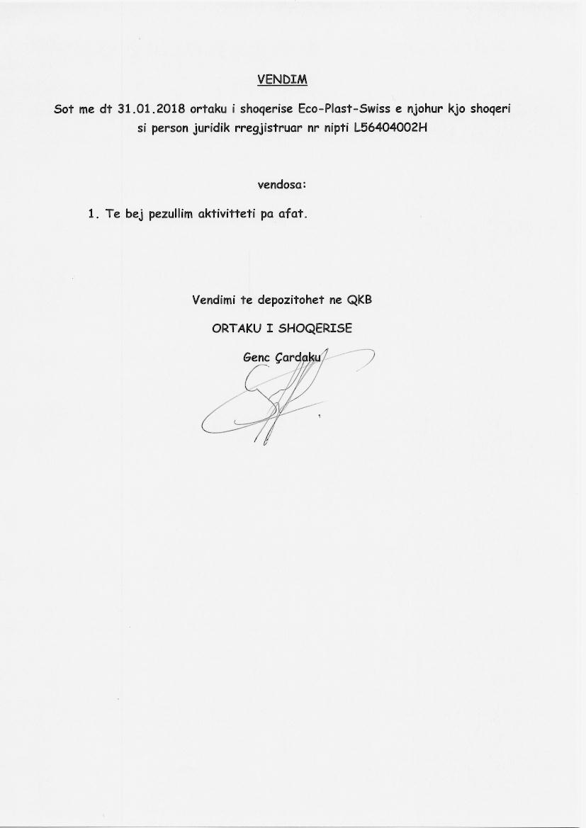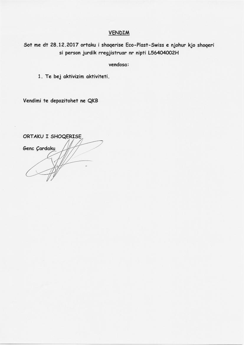 → Ekstrakt historik i regjistrit tregtar date 08.10.2021 → Statusi i shoqerise → Vendimi i ortakut te vetem per aktivizimin e shoqerise date 28.12.2017 → Vendimi i ortakut te vetem per pezullimin e aktivitetit date 31.01.2018 → Vendim i ortakut te vetem per pezullimin e aktivitetit date 06.07.2017 |