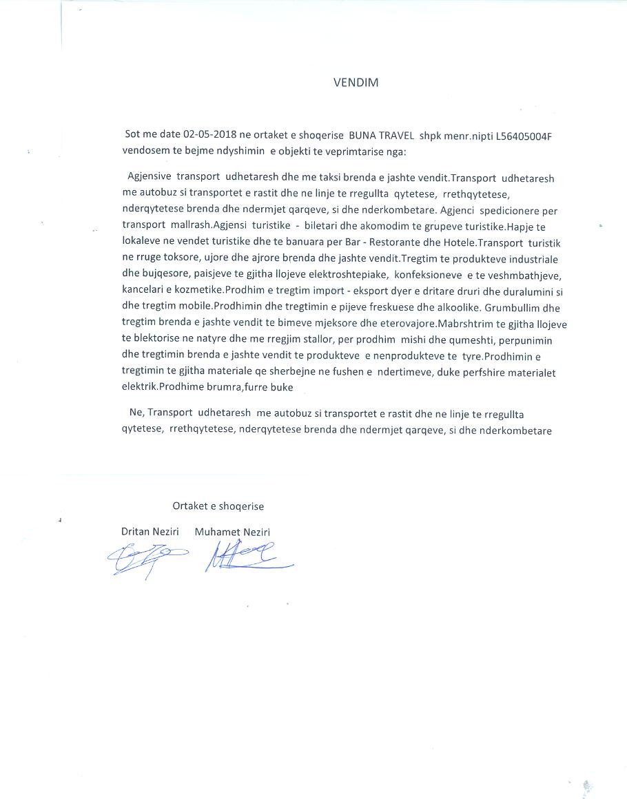→ Ekstrakt Historik i Regjistrit Tregtar, date 6.12.2021 → Statuti i shoqerise, date 03.02.2015 → Vendimi i Asamblese se Ortakeve, date 02.05.2018 |