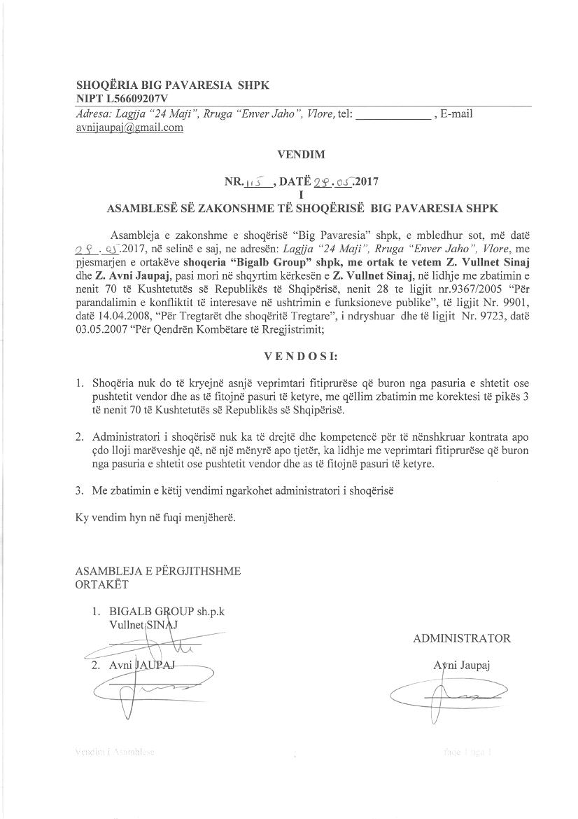 | Shënime: | Kompetencat e Administratorit: Administratori i shoqerise nuk ka te drejte dhe kompetence per te nenshkruar kontrata apo cdo lloj mareveshje qe ne nje menyre apo tjeter, ka lidhje me veprimtari fitimprurese qe buron nga pasuria e shtetit ose pushtetit vendor dhe as te fitojne pasuri te ketyre. |