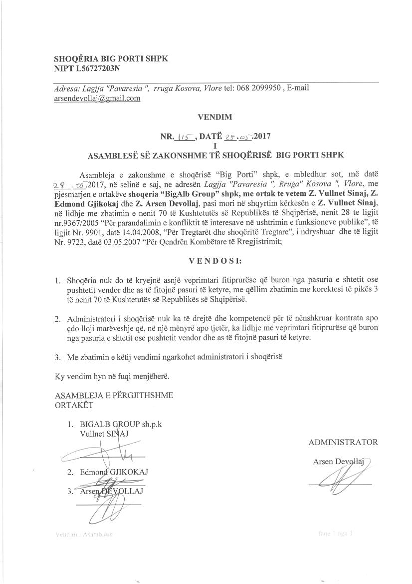 | Shënime: | Kompetencat e Administratorit: Administratori i shoqerise nuk ka te drejte dhe kompetence per te nenshkruar kontrata apo cdo lloj mareveshje qe ne nje menyre apo tjeter, ka lidhje me veprimtari fitimprurese qe buron nga pasuria e shtetit ose pushtetit vendor dhe as te fitojne pasuri te ketyre. |