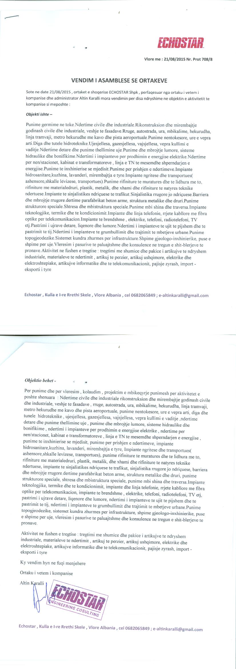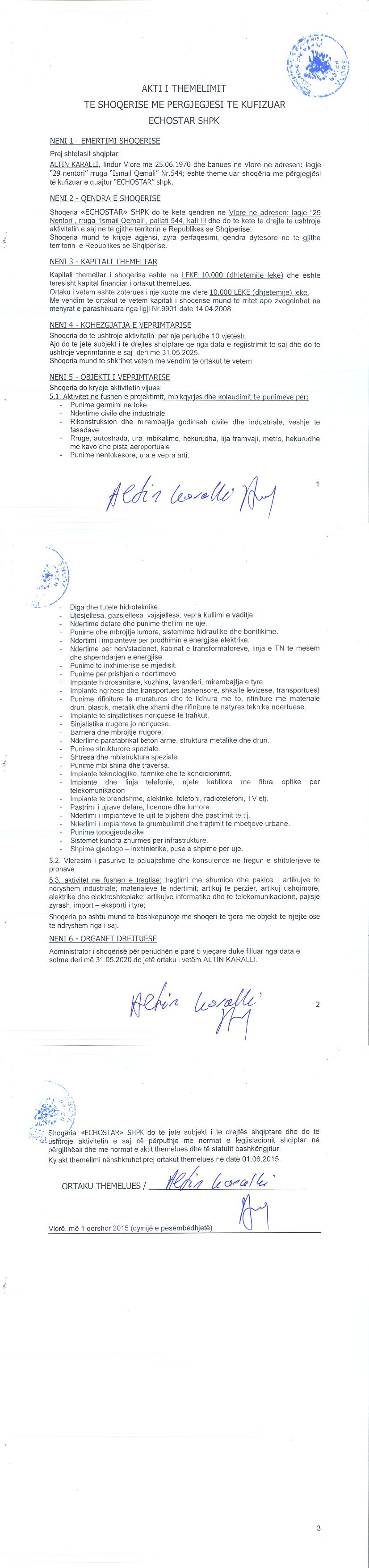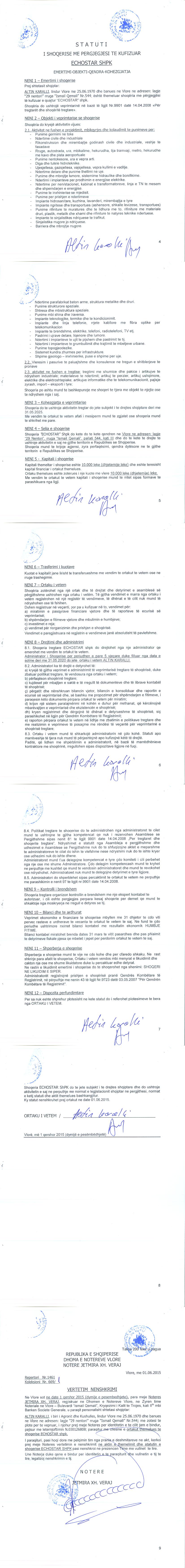 → Ekstrakt Historik i Regjistrit Tregtar, date 10.1.2022 → Akt themelimi, date 01.06.2015 → Statuti i shoqerise, date 01.06.2015 → Vendimi i asamblese se ortakeve, date 21.08.2015 |