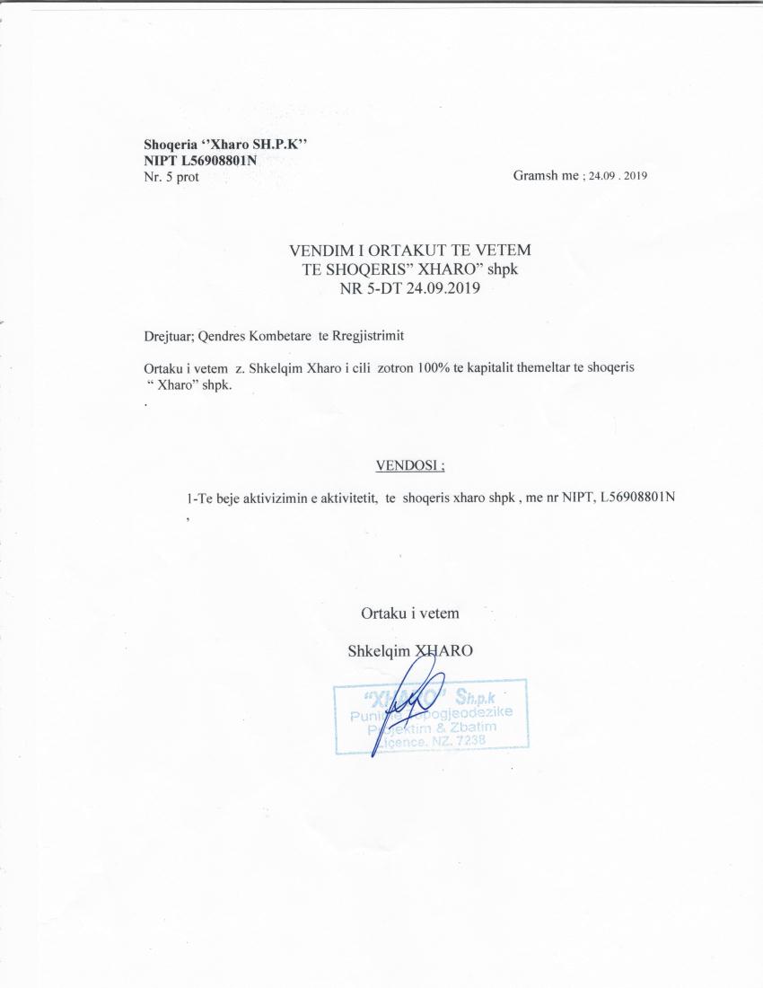 → Ekstrakti historik i regjistrit tregtar 05.02.2022 → Akti i themelimit te shoqerise → Vendimi per pezullimin e aktivitetit 13.08.2019 → Vendimi per riaktivizimin e shoqerise 24.09.2019 → Vendimi i ortakut te vetem per pezullimin e aktivitetit date 14.10.2019 |