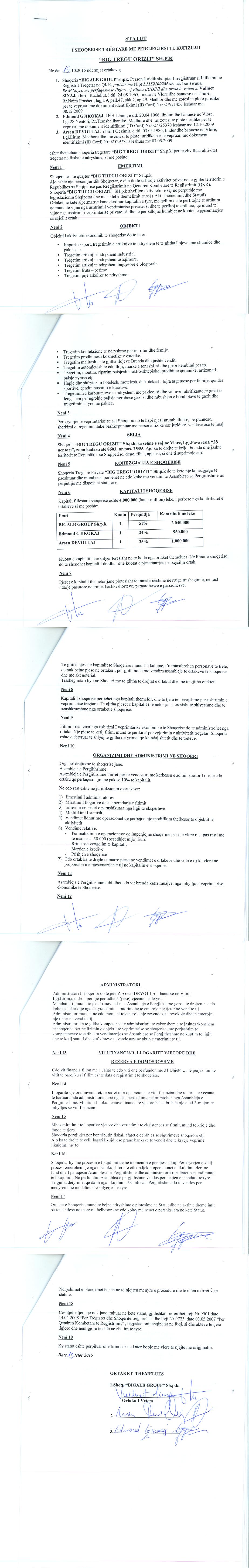 | Shoqëri Mëmë / Zotërues për këtë Subjekt: | “BIGALB GROUP”, shoqëri me përgjegjësi të kufizuar, e themeluar më datë 17/03/2011, sipas ligjeve të Republikës së Shqipërisë, me numër identifikimi në regjistrin tregtar NIPT L11521002M, me adresë në aktuale në Tirane Vaqarr GROPAJ Fshati Gropaj, Godina Tirana Cash & Carry, Kati 2, Vaqarr, dhe me administrator Elona Koshi. Ortak i vetëm i shoqërisë është Vullnet Sinaj (zoterues pasiv), zotërues për 100% të kapitalit. (Sipas të dhënave të QKB deri më datë 02.09.2024) Sipas Ekstraktit Historik te Regjistrit te Pronarit Perfitues, depozituar në QKB date 26.03.2021, terhequr datë 02.09.2024, Pronaret perfitues te subjektit “BIG TREGU ORIZIT”, zoterues te 25% te kapitalit e me teper, janë: Vullnet Sinaj, shtetas shqiptar, i datelindjes 1965, pronar perfitues per 51% te pronesise pasi zoteron 100% te kapitalit të “BIGALB GROUP” shpk – shoqëri mëmë për 51% te “BIG TREGU ORIZIT”. Data e percaktimit si pronar perfitues është 15.10.2015. Arsen Devollaj, shtetas shqiptar, i datelindjes 1986, pronar perfitues per 25% te pronesise në formë direkte. Data e percaktimit si pronar perfitues është 15.10.2015. |