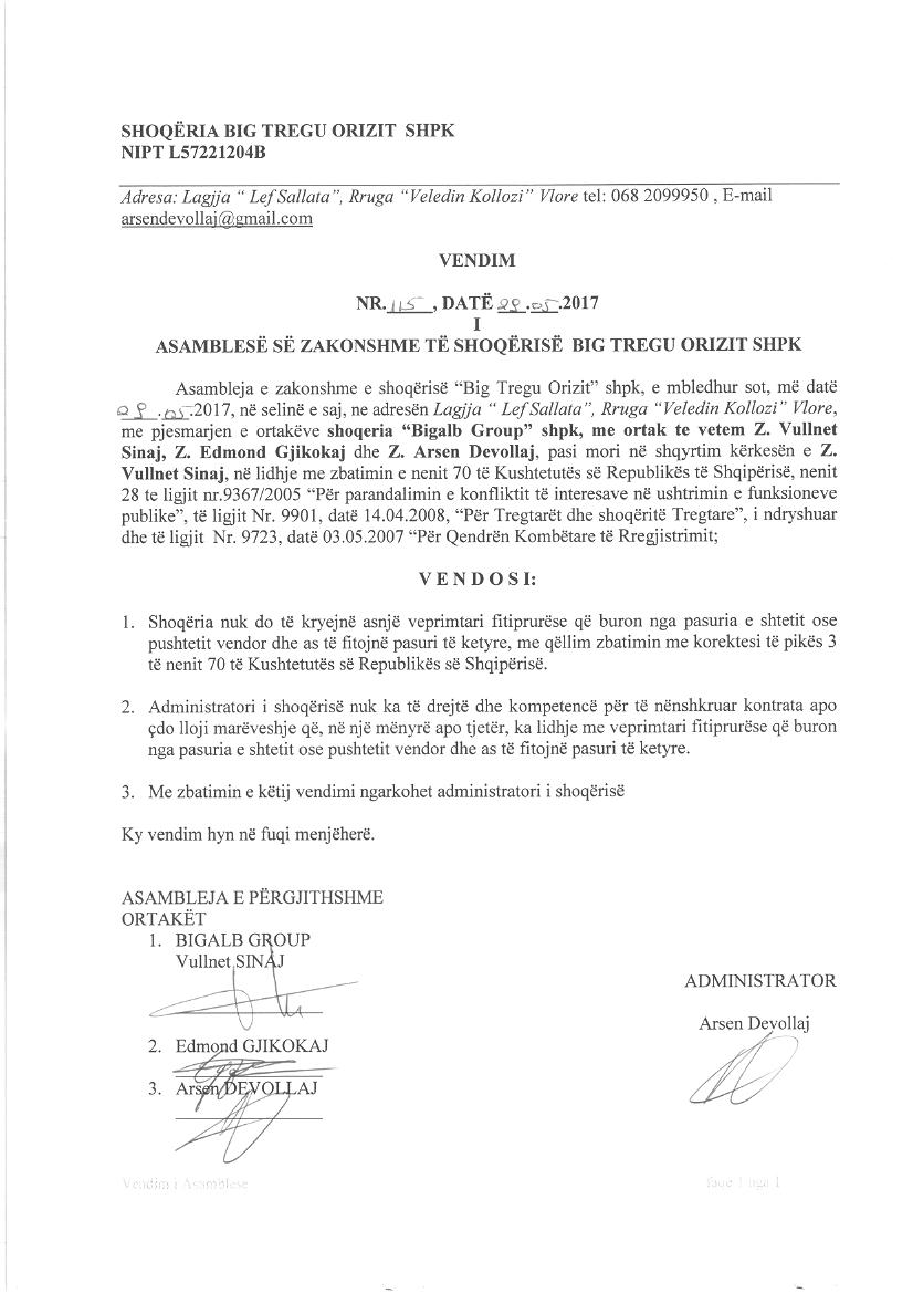 | Shënime: | Kompetencat e Administratorit: Administratori i shoqerise nuk ka te drejte dhe kompetence per te nenshkruar kontrata apo cdo lloj mareveshje qe ne nje menyre apo tjeter, ka lidhje me veprimtari fitimprurese qe buron nga pasuria e shtetit ose pushtetit vendor dhe as te fitojne pasuri te ketyre. |