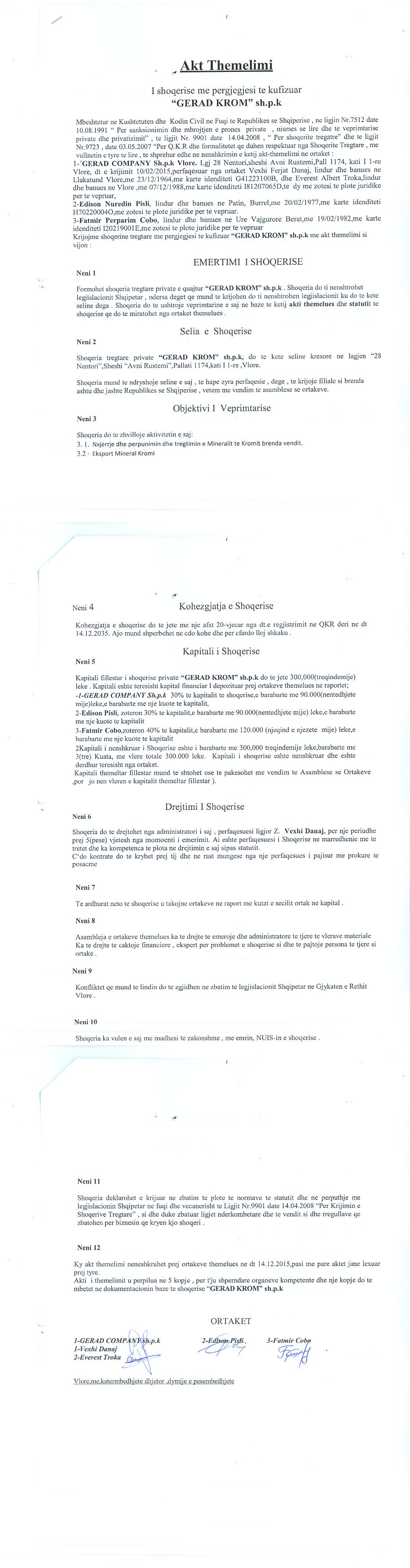 | Objekti i Veprimtarisë: | Nxjerrje dhe perpunimin dhe tregtimin e mineralit te kromit brenda vendit.Eksport mineral kromi.Shfrytezimi te mineralit te kromit me karrjere dhe tregtimit te tij brenda e jashte vendit.Tregtim me shumice dhe pakice dhe import-eksport te mallrave te ndryshme industriale, etj.Transport mallrash brenda dhe jashte vendit.Transportimi, tregtimi, ruajtja, perdorimi dhe evidentimi i materialeve plasese dhe shperthyese te perdorimit civil. |