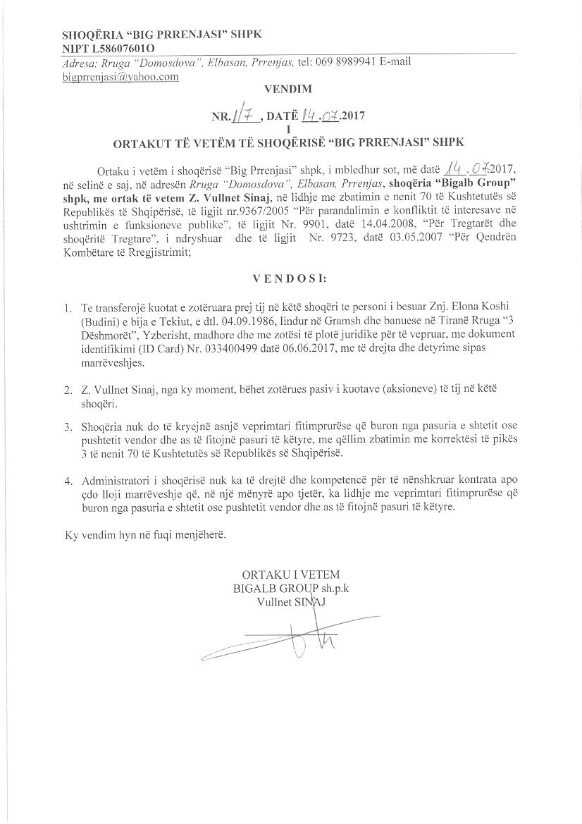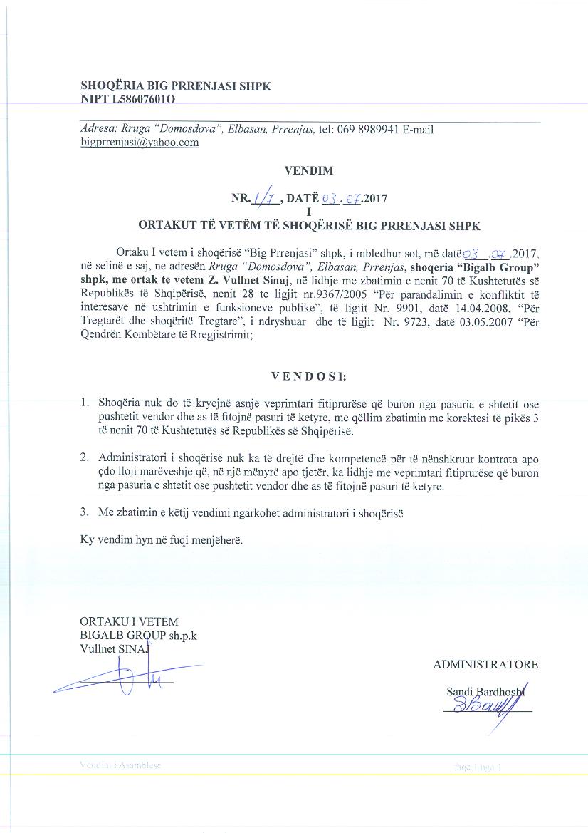 | Shënime: | Kompetencat e Administratorëve: Administratori i Shoqërisë nuk ka të drejtë dhe kompetencë për të nënshkruar kontrata apo çdo lloj marrëveshje që në një mënyrë apo tjetër, ka lidhje me veprimtari fitimprurëse që buron nga pasuria e shtetit ose pushtetit vendor dhe as të fitojnë pasuri të këtyre. |