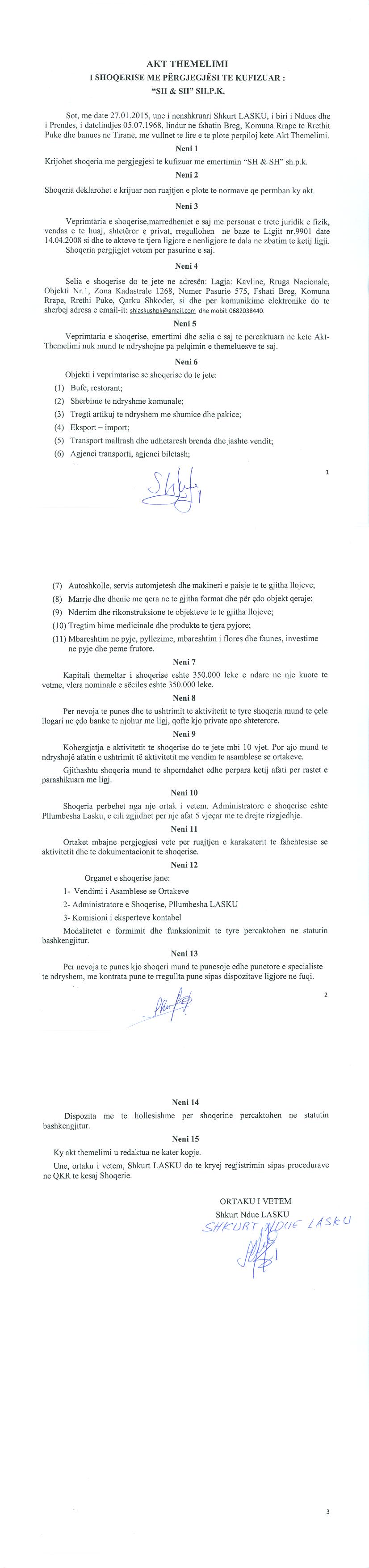 | Emërtime të tjera Tregtare: | "SH & SH" SH.P.K. |