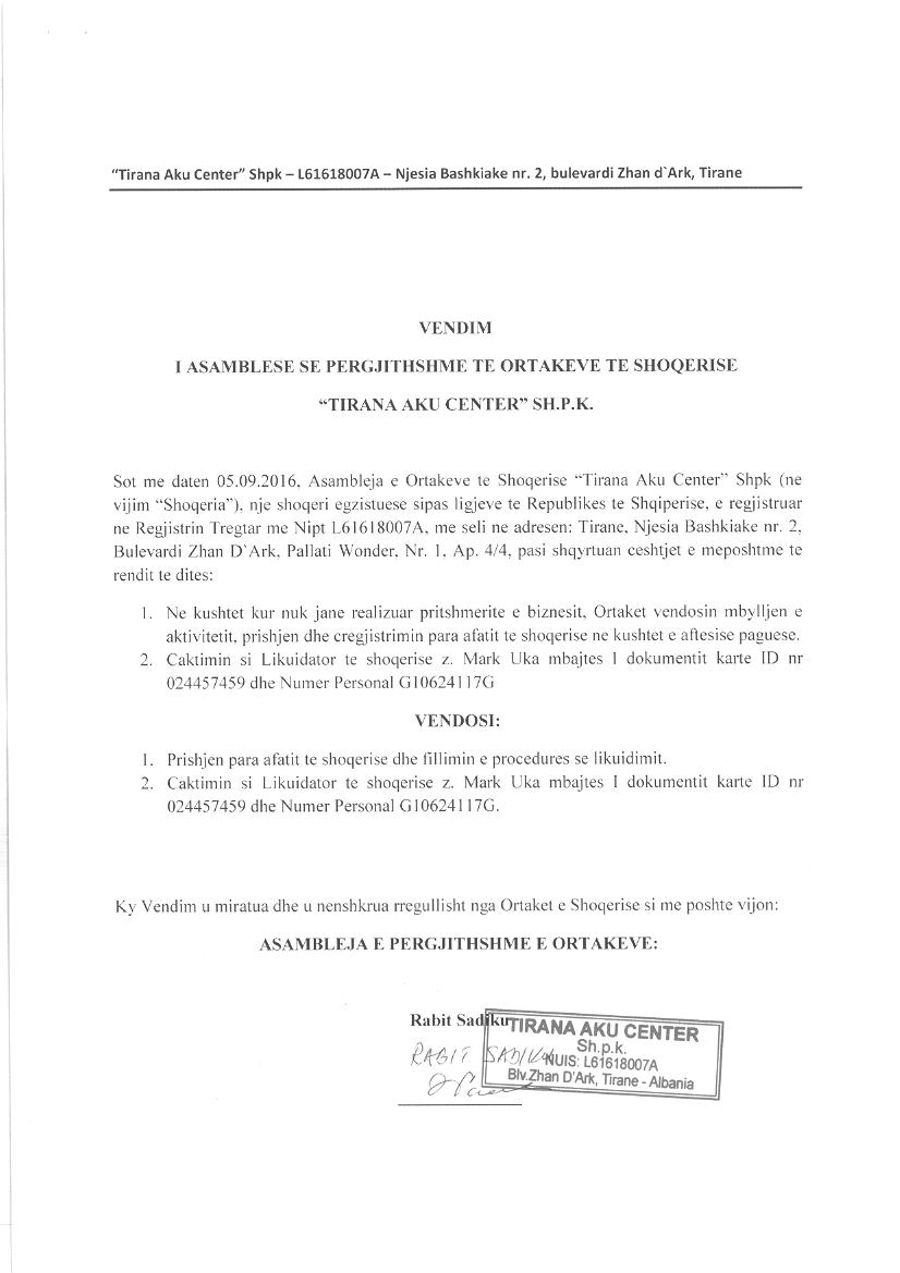 | Çështje Ligjore: | Me date 05.09.2016, me vendim te ortakut te vetem, u vendos : Prishja e Shoqerise. Statusi i Shoqerise kalon nga "Aktiv" ne "Shoqeri ne Likuidim e Siper". |