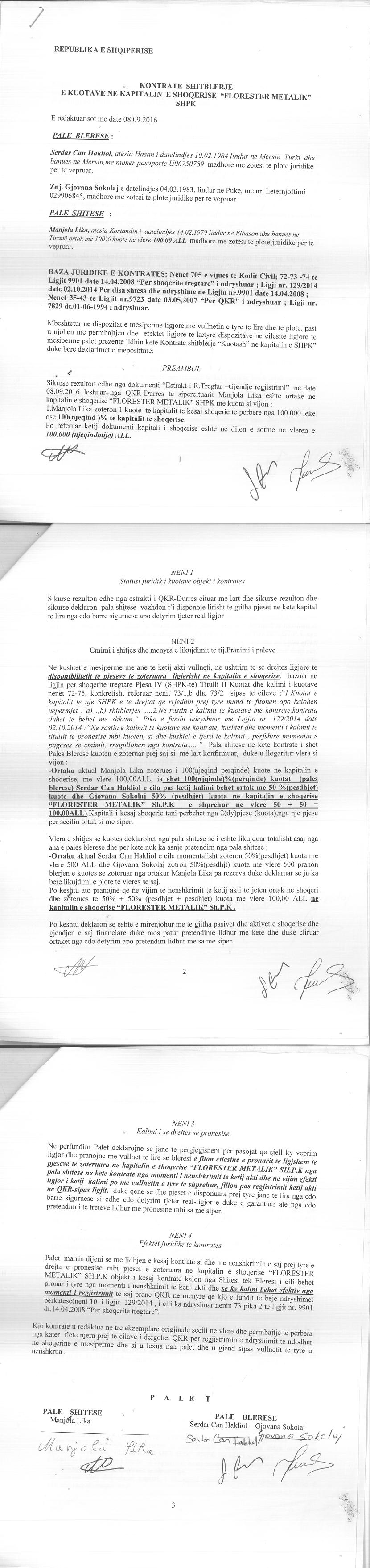 → Ekstrakti Historik i Regjistrit Tregtar date 22.08.2024 → Akti i themelimit te Shoqerise → Ekstrakti Historik i Regjistrit te Pronarit Perfitues date 22.08.2024 → Kontrate e shitblerjes se kuotave date 08.09.2016 |