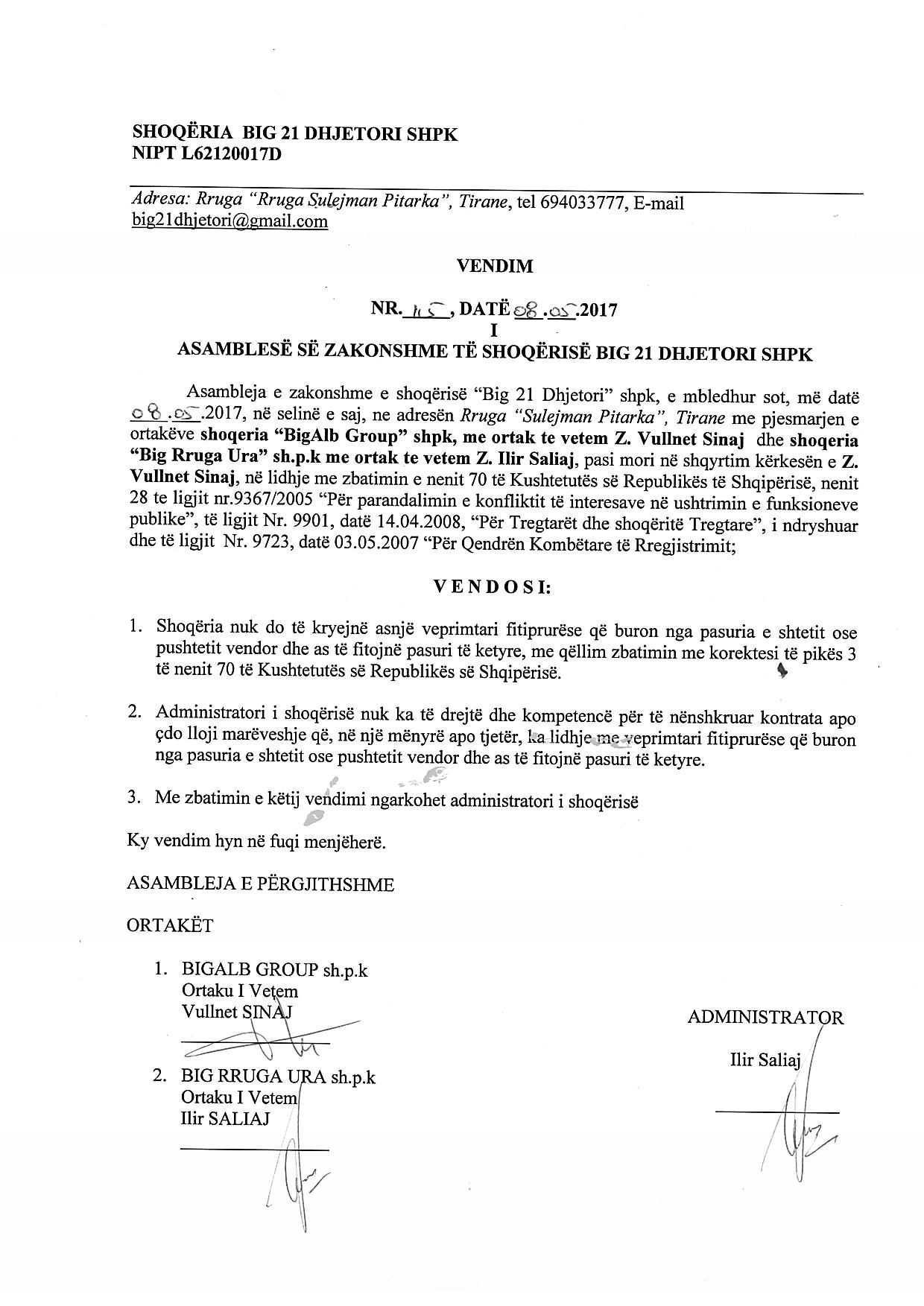 | Shoqëri Mëmë / Zotërues për këtë Subjekt: | I. “BIGALB GROUP”, shoqëri me përgjegjësi të kufizuar, e themeluar më datë 17/03/2011, sipas ligjeve të Republikës së Shqipërisë, me numër identifikimi në regjistrin tregtar NIPT L11521002M, me adresë në aktuale në Tirane Vaqarr GROPAJ Fshati Gropaj, Godina Tirana Cash & Carry, Kati 2, Vaqarr, dhe me administrator Elona Koshi. Ortak i vetëm i shoqërisë është Vullnet Sinaj (zoterues pasiv), zotërues për 100% të kapitalit. (Sipas të dhënave të QKB deri më datë 13.08.2024) II. “BIG RRUGA URA”, shoqëri me përgjegjësi të kufizuar, e themeluar më datë 22/01/2015, sipas ligjeve të Republikës së Shqipërisë, me numër identifikimi në regjistrin tregtar NIPT L51323025M, me adresë në aktuale në Tirane Njesia Bashkiake nr. 4, rruga Myslym Keta, godina nr.33, perballe Komisariatit nr.4, dhe me administrator Alma Sinanaj. Ortak i vetëm i shoqërisë është Ilir Saliaj, zotërues për 100% të kapitalit. (Sipas të dhënave të QKB deri më datë 13.08.2024) Sipas Ekstraktit Historik te Regjistrit te Pronarit Perfitues, depozituar në QKB date 11.03.2021, terhequr datë 13.08.2024, Pronaret perfitues te subjektit “BIG 21 DHJETORI”, zoterues te 25% te kapitalit e me teper, janë: Ilir Saliaj, shtetas shqiptar, i datelindjes 1963, pronar perfitues per 49% te pronesise pasi zoteron 100% te kapitalit të “BIG RRUGA URA” shpk – shoqëri mëmë për 49% te “BIG 21 DHJETORI”. Data e percaktimit si pronar perfitues është 19.06.2016. Vullnet Sinaj, shtetas shqiptar, i datelindjes 1965, pronar perfitues per 51% te pronesise pasi zoteron 100% te kapitalit të “BIGALB GROUP” shpk – shoqëri mëmë për 51% te “BIG 21 DHJETORI”. Data e percaktimit si pronar perfitues është 19.06.2016. |