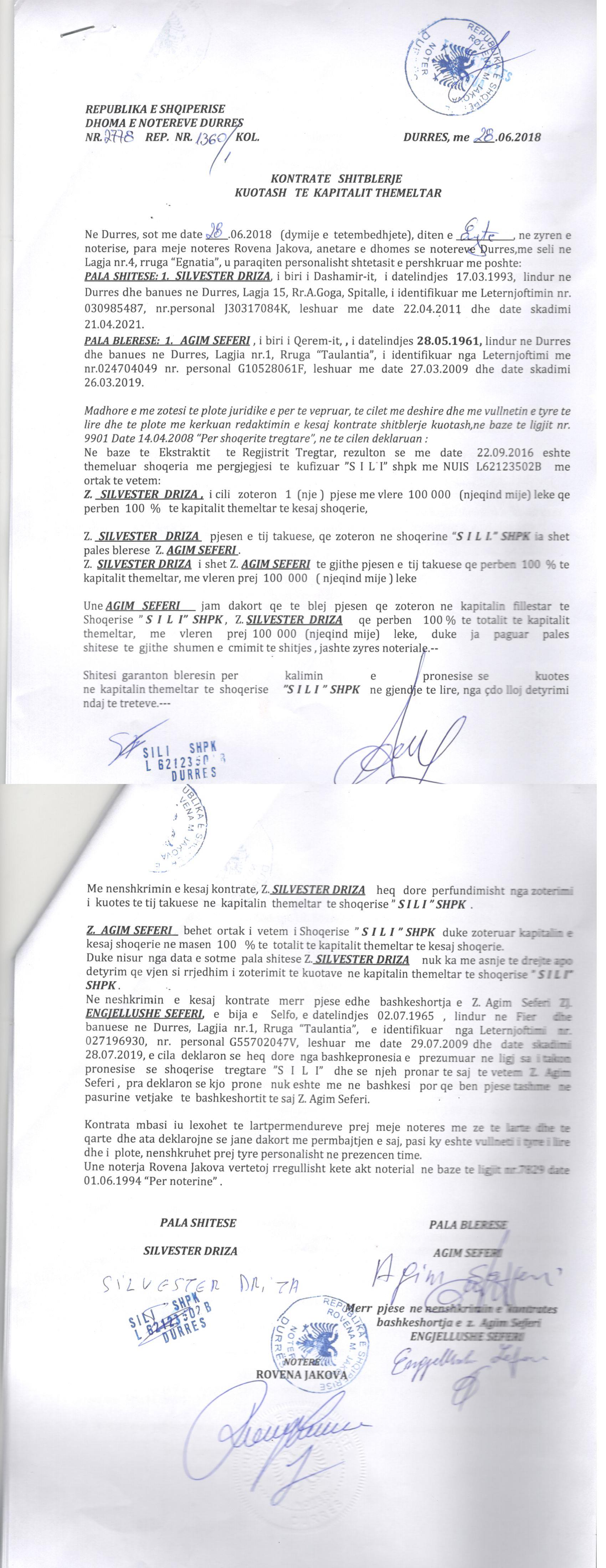 → Ekstrakt Historik i Regjistrit Tregtar date 17.07.2023 → Deklaratë për Njohjen, Pranimin dhe Zbatimin e Dispozitave Ligjore në Fuqi → Kontratë Shitblerje Kuotash të Kapitalit Themeltar datë 28.06.2018 |